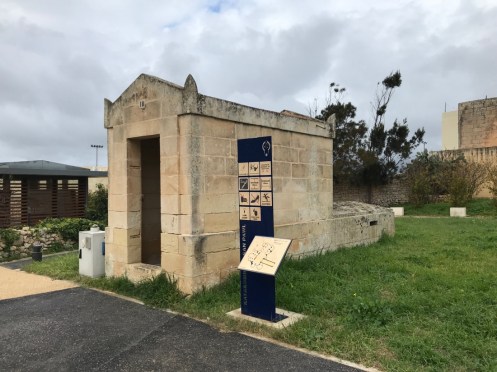 Il y avait deux endroits à visiter. D’un côté de la rue un musée explicatif et d’immenses catacombes. De l’autre côté de la rue, dans un grand parc 23 petites constructions comme celle, nous descendions et la visite était rapide. Les amandiers sont en avance par rapport à chez nous. Il y a déjà des fleurs et des amandes. Pour sortir des catacombes il fallait traverser la boutique de souvenirs où j’ai eu la bonne idée d’acheter deux capes de pluie. Mais voyons Aline, si tu avais une liste de choses à emporter en voyage, les tiennes ne seraient pas restées dans ton armoire à Vestric !!! Je disais donc que j’ai eu un éclair de génie car il s’est mis à pleuvoir à très fort… il avait déjà un peu bruiné lorsque nous visitions Mdina mais très vite le soleil était revenu.