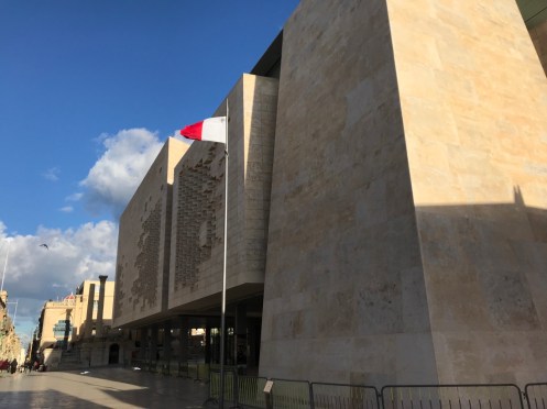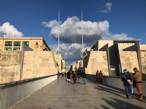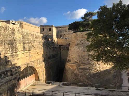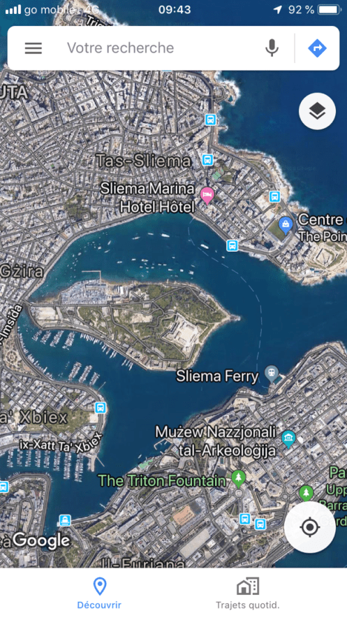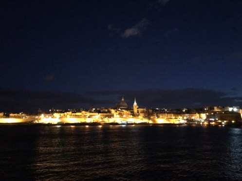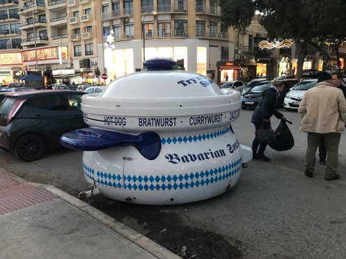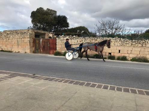 En attendant le bus au bord de la route, un sulky s’entraîne. On va le voir remonter à fond de train. En retournant à La Valette, la campagne et ses murets. Et revoilà la fontaine des tritons à l’entrée de la vieille ville. Le pont pour rentrer en ville. Entrée moderne qui tranche avec les vieilles pierres de la ville. À gauche du pont. À droite. L’entrée de la vieille ville. Petit tour en ville pour rechercher vainement un guide de randonnée. Arrêt dans le Café Cordina, un des cafés les plus vieux de La Valette pour manger une salade. Retour à Sliema avec le ferry au moment du coucher du soleil. Le marchand de saucisses est en train de fermer. Et voilà c’est fait. Promenade jusqu’au centre commercial qui était fermé le premier jour. Toujours les mêmes enseignes. Ici les soldes ont commencé mais nous n’avons besoin de rien. Au retour vue sur La Valette illuminée. Sur la photo de la carte, nous habitons Sliema à l’endroit du petit point rose. Nous prenons le ferry pour aller à La Valette qui est en bas de la carte ou le bus qui est obligé de faire un grand détour car la baie est très profonde. Sliema est la ville des hôtels, à La Valette il y en a très peu et ils sont beaucoup plus chers.