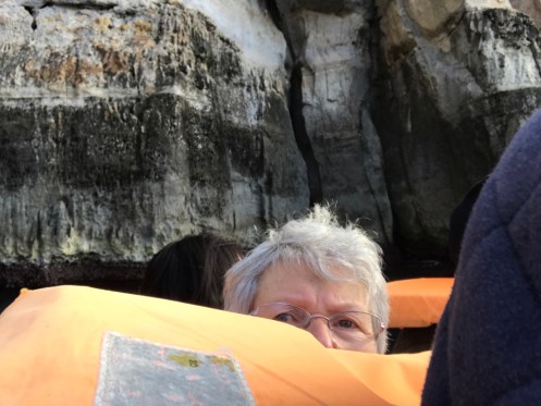J’ai des difficultés pour faire des photos. Le gilet de sauvetage me gêne, je suis au dernier rang entre deux personnes !!! Celui de devant me coupe la vue ainsi que ceux qui sont à ma droite et à ma gauche… Tant pis pour les photos je publierai ce que j’ai pu faire. Yves est avec son appareil photo, je ne peux pas les récupérer.