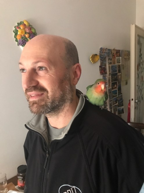 Le logeur d’Yves avec son perroquet. Très sympa et surtout il parle français. Le logeur, pas le perroquet !!!