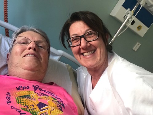 Arrivée d’un commando (elles sont deux) pour faire ma toilette. Aujourd’hui savonnage et rinçage à grande eau sur le lit. D’habitude on savonne et on essuie sans rinçage avec le drap.