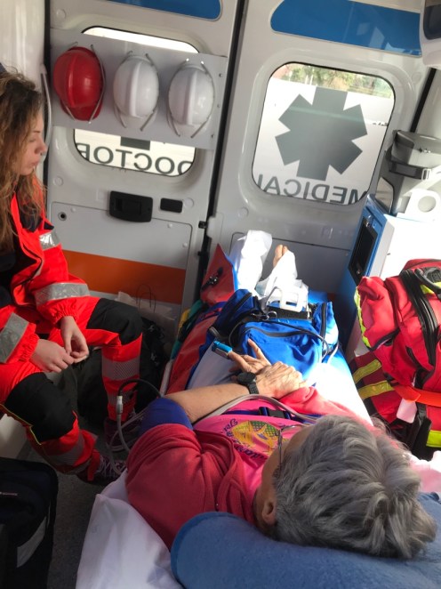 11 h35. Je quitte San Filippo Neri en ambulance avec un médecin et un infirmier français qui arrivent de Lyon en avion sanitaire.