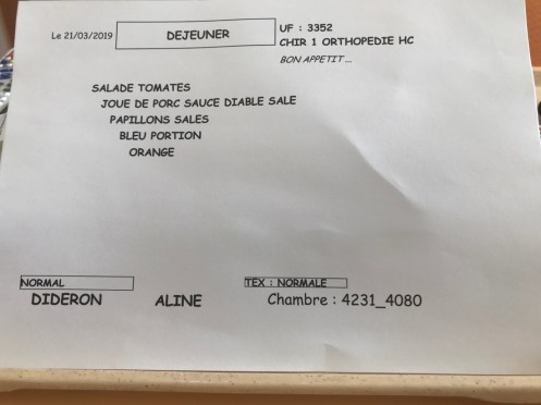 Visites qui se sont succédées. Chacun prenant la suite de l’autre. Yves. Claire. Danielle. Tatie Arlette. Un petit arrêt, j’en profite pour lire ou écouter mes messages et écrire mon blog. Et pour terminer Anne pendant mon repas du soir.