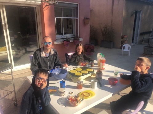 Petit déjeuner avec croissant bien « mouligou ». C’est dimanche, j’en ai voulu un, à la place des biscottes, ce n’était pas le meilleur choix !!! Heureusement qu’il y avait les mandarines de Tatie Arlette pour finir le repas. Et dire que j’ai des Petits Lu dans le placard et que je n’ai pas voulu les sortir…