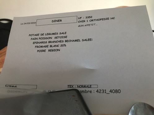 Après un FaceTime avec Tatie Arlette, la lecture du dernier chapitre de la Librairie de la place aux Herbes (agréable à lire, on rentre facilement dans la peau des personnages. Très bon livre lorsqu’on est à l’hôpital), j’attends avec impatience le petit déjeuner.