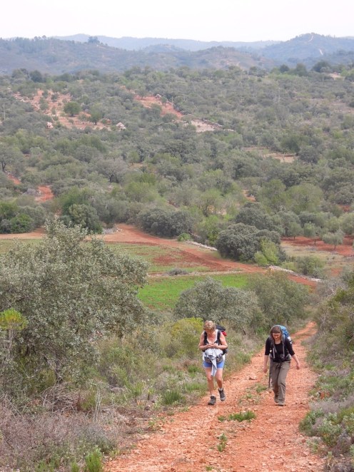 29 mars 2012. Via Algarviana. Notre première randonnée itinérante seuls, tous les deux. 2 semaines de traversée de l’arrière-pays de l’Algarve d’Alcoutim au Cap Saint Vincent. Randonnée que nous avions trouvée sur un site internet avec les cartes de toutes les étapes. Pas de GPS à l’époque et un portable qui ne servait qu’à téléphoner. Région très peu peuplée. J’avais retenu tous les hébergements avant de partir. Nous avons très vite été rejoints par deux autrichiens qui ne se connaissaient pas au départ. Un garçon qui ne marchait pas avec nous dans la journée et Regina qui est restée avec nous jusqu’à Silves où nous j’avais retenu deux nuits pour couper le voyage. Elle était repartie le lendemain avec des Belges car son billet d’avion ne lui permettait pas de faire une pause. Nous l’avions « sauvée » lors de quatrième jour. Ce jour là, il fallait aller dormir plus loin que la fin de l’étape dans une vieille école. On nous avait proposé de nous y emmener en voiture. Ok pour tout le monde sauf Yves qui décide d’y aller à pied. Yves s’en va. Peu de temps après Regina décide de partir aussi à pied. Il n’y a que l’autrichien et moi qui y allons en voiture. Nous nous installons dans l’école. Yves arrive dans l’après-midi. Une heure, deux heures, trois heures après son arrivée toujours pas de Regina. Je suis très inquiète, il va bientôt faire nuit et il n’y a que des collines à perte de vue. Heureusement que j’ai noté son numéro de téléphone. Je l’appelle en Anglais (ich spreche kein Deutsch) (traduction Reverso), elle est perdue évidemment, elle a raté des flèches, d’après ce qu’elle me décrit et grâce à Yves qui a fait le trajet nous arrivons à la remettre sur le bon chemin, antennes visibles au loin… yves part à sa rencontre. Ouf, le soir elle dort avec nous et ne nous quittera plus.