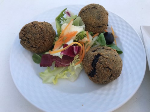 Arrêt à Es Migjorn Gran pour manger des tapas. Croquettes à l’encre de seiche, un délice.