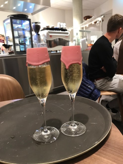 Arrêt dans une pâtisserie, chocolaterie. Non, ce n’est pas pour nous c’est pour la table voisine. Ça fait partie d’un « afternoon tea » à 450 couronnes pour 2 personnes. Je convertis 60€ !!! Il y avait cette boisson, une boisson chaude, différents gâteaux, chocolats et petits sandwichs. Les repas au Danemark sont un peu chers !!!