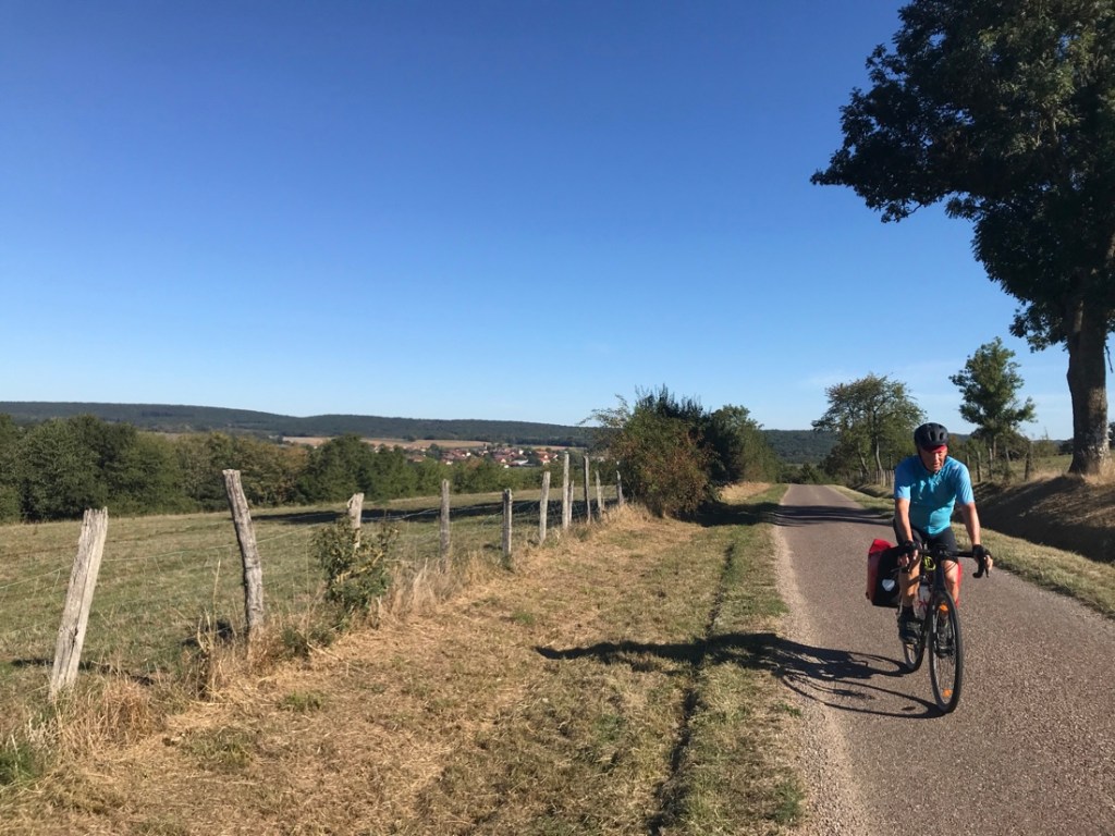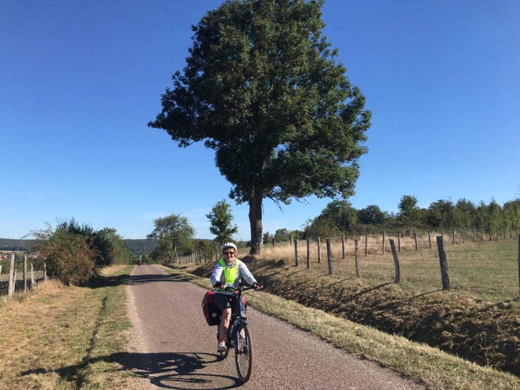 Aujourd’hui, fini le canal des Vosges nous venons de trouver la Saône. Journée sur des petites routes, très peu de voies vertes, c’est beaucoup plus vivant, varié et bien vallonné, heureusement que nous sommes trois à avoir l’assistance électrique. Bravo à Yves qui roule sans assistance !!!
