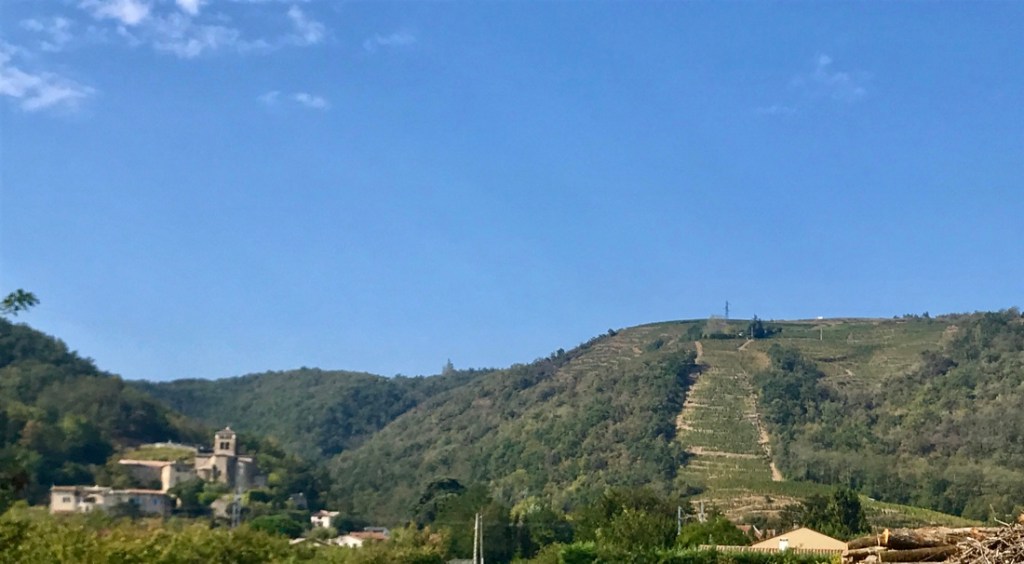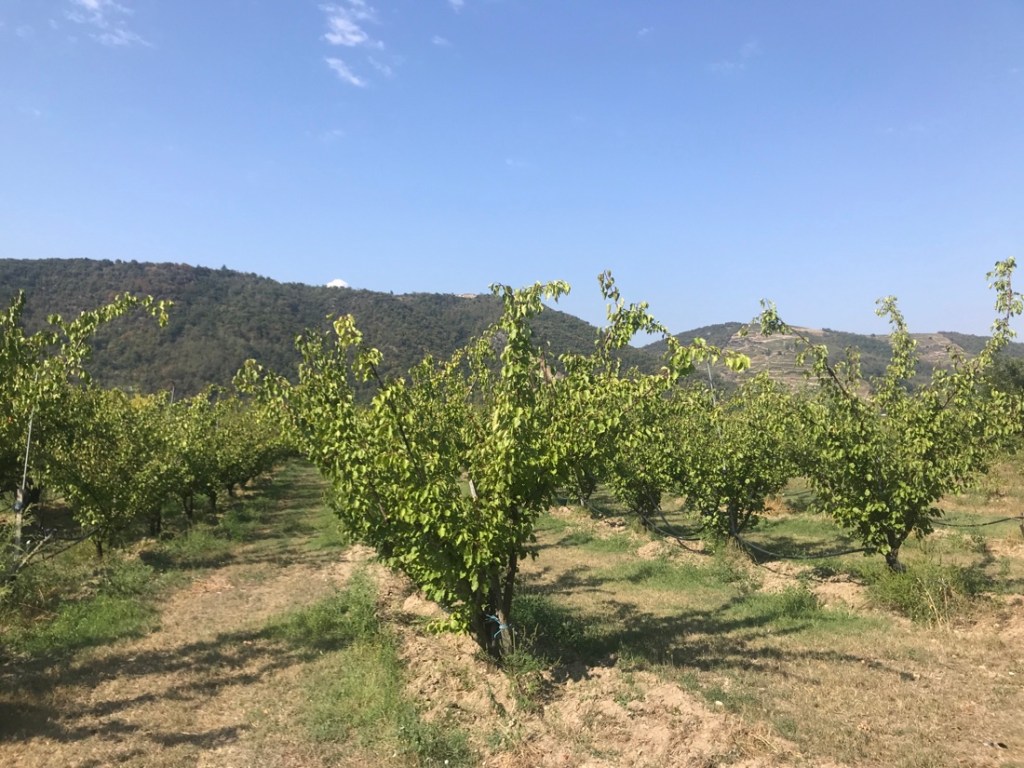 Depuis notre départ toutes les vignes sont cultivées en pente (à droite). Dans la plaine, on trouve les fruitiers en majorité abricotiers.