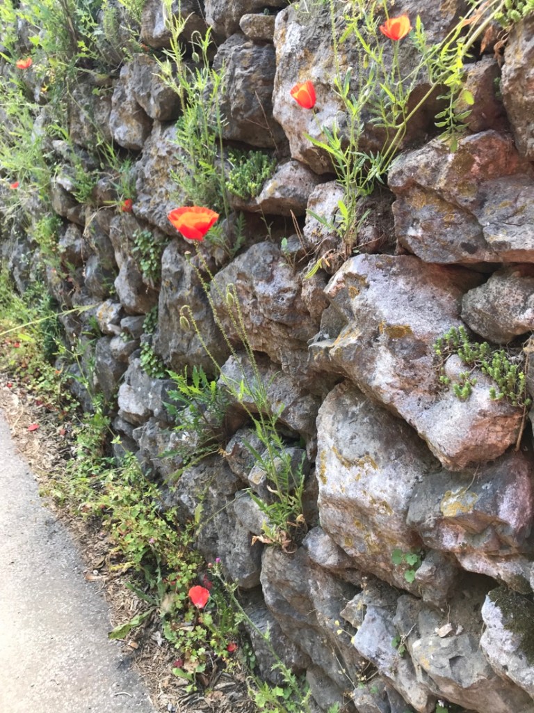 Chemin rempli de coquelicots pour aller à notre chambre d’hôtes.
