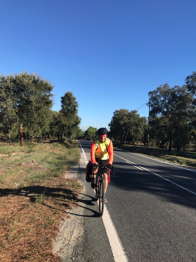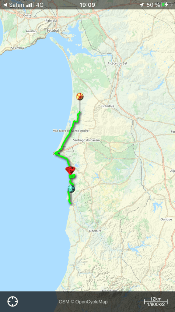 Notre trajet d’aujourd’hui. Celui qui est prévu sur le site de l’euro vélo 1. Nous sommes partis de Melides là où il y a le mât avec le ballon pour arriver à Porto Covo la toupie rouge en passant par Sines partie pointue de la côte. Nous ne sommes pas allés jusqu’au bout volontairement car l’étape nous semblait trop longue.