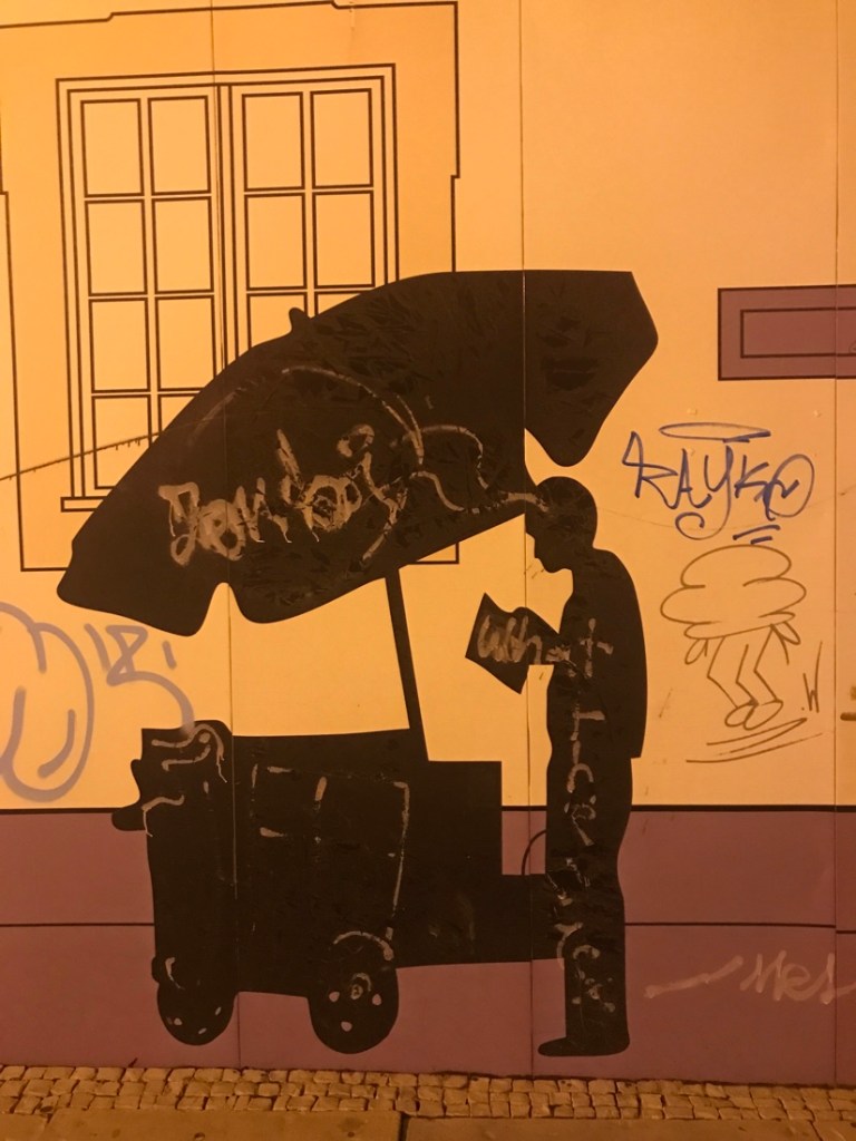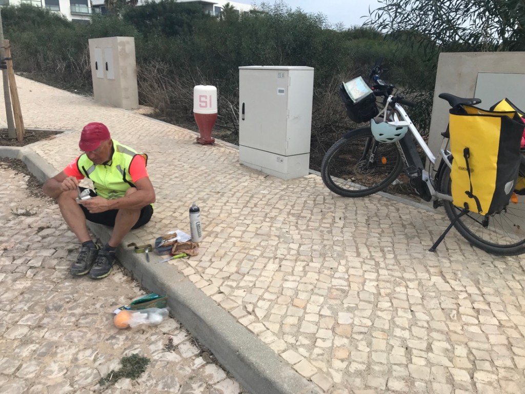Repas de midi à l’abri du vent. Comme le vent soufflait très fort aujourd’hui, nous avons préféré ne pas manger au restaurant, pour arriver plus vite à Faro.