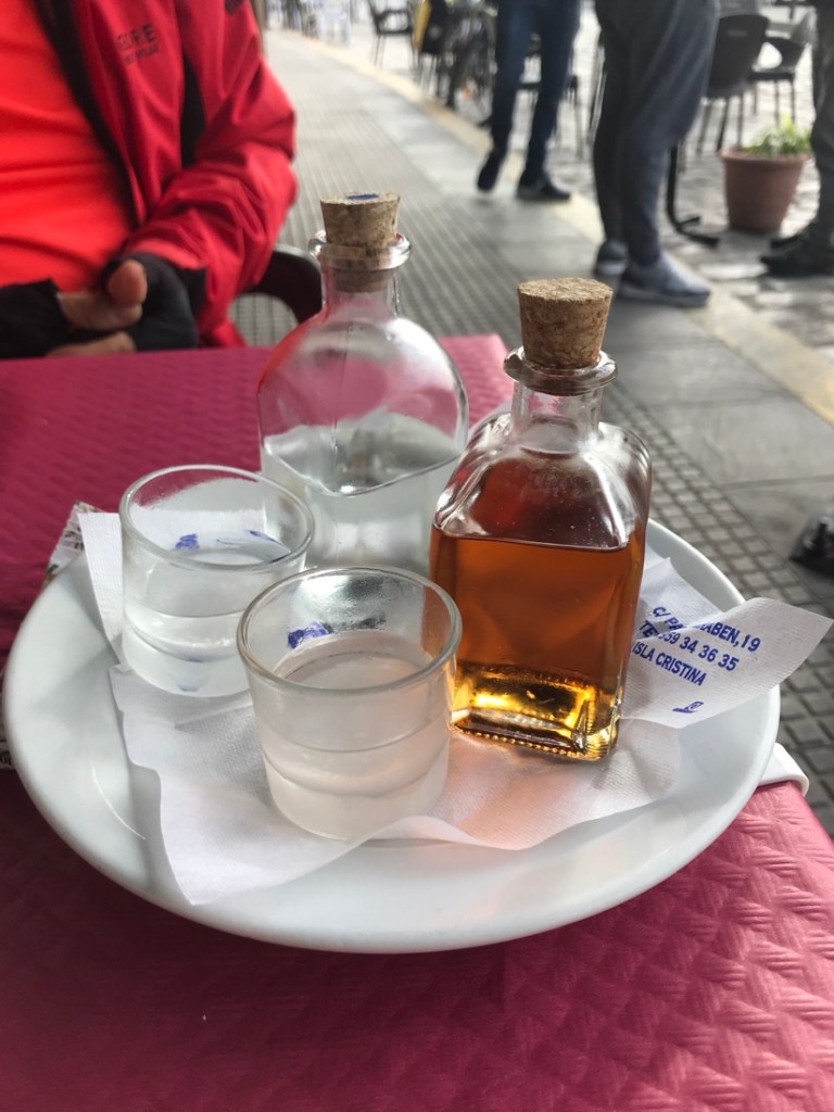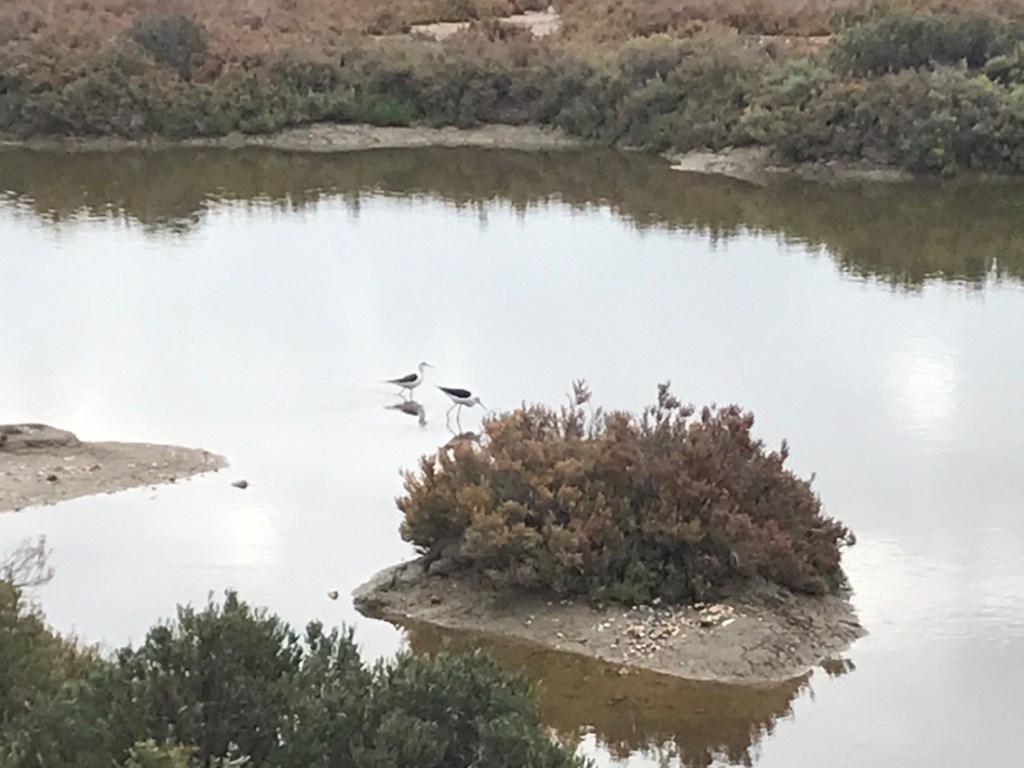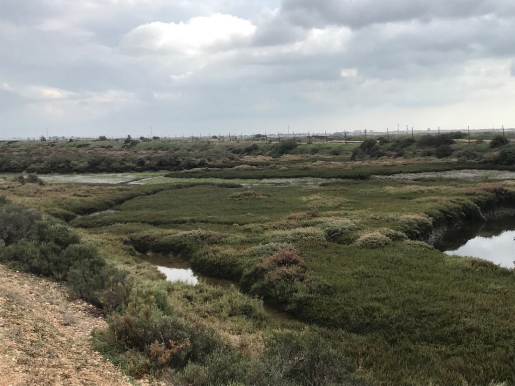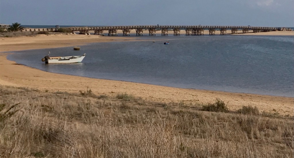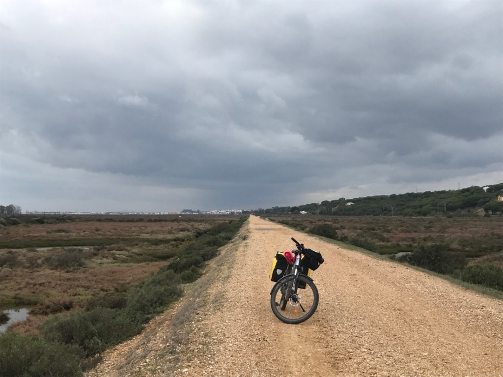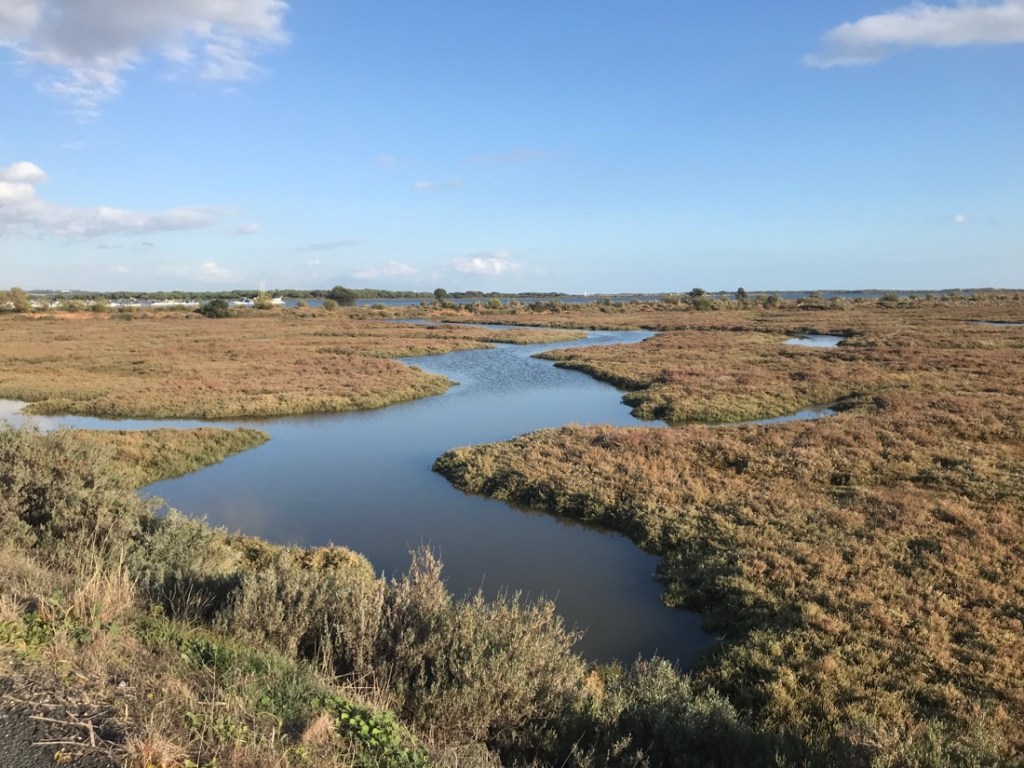 Le trajet d’aujourd’hui est un peu compliqué. Nous avions deux options, nous n’avons pas choisi la bonne. Nous sommes partis d’Ayamonte en direction de l’Isla del Moral, le trajet qui descend, pensant que nous trouverions un bateau pour traverser et arriver à Isla Cristina. Trop tard dans la saison, le bateau ne fonctionnait pas. Nous sommes revenus à Ayamonte, 20 km aller et retour et avons pris le trajet du haut qui passait juste à côté de l’endroit où nous étions allés au départ, mais de l’autre côté de la rivière !!!
