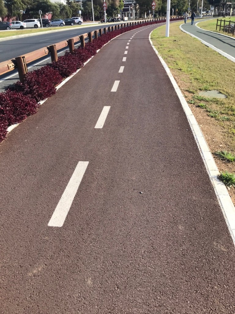 Huelva. Nous sommes bien sur l’eurovelo1. Ce passage au niveau de la ville a été un cauchemar, une circulation infernale, des voitures qui roulaient aussi vite que sur l’autoroute. À un moment dans un rond-point où il y avait une sortie, j’ai été obligée de repartir en arrière, de traverser la route et de prendre le rond-point à l’envers.