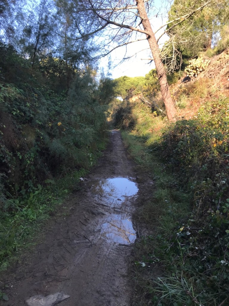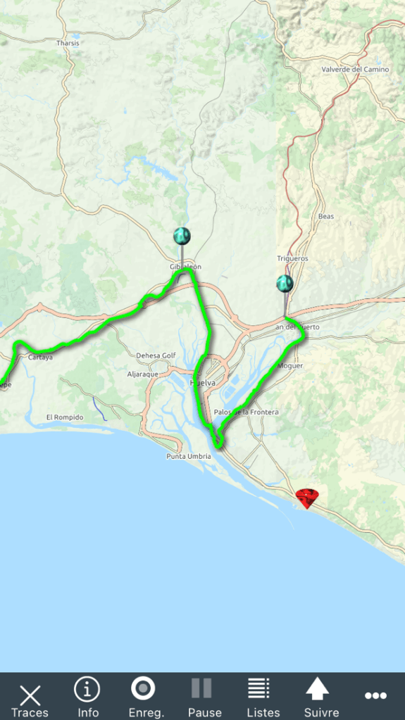 Le trajet du jour, de Lepe, bord gauche, à la toupie. Lorsque nous sommes arrivés au point le plus bas nous avons continué au bord de l’eau pour arriver à Mazagón. Nous ne sommes pas remontés jusqu’au poteau d’arrivée de cette étape. Nous quittons l’eurovelo1 qui ne passe pas par Seville.