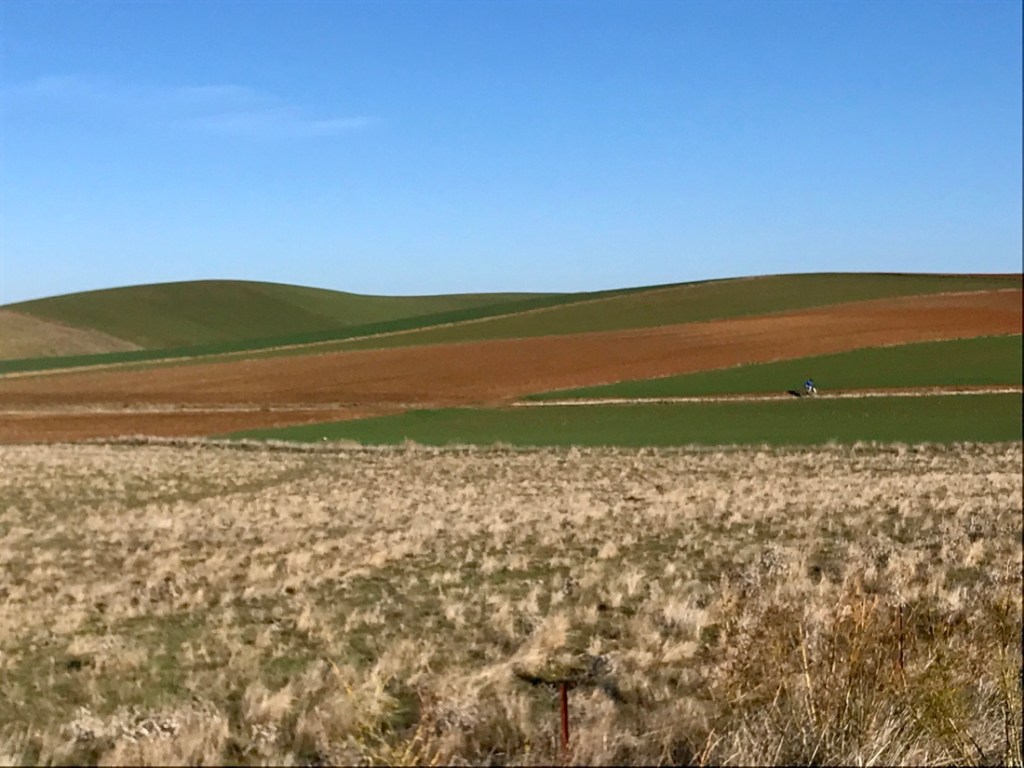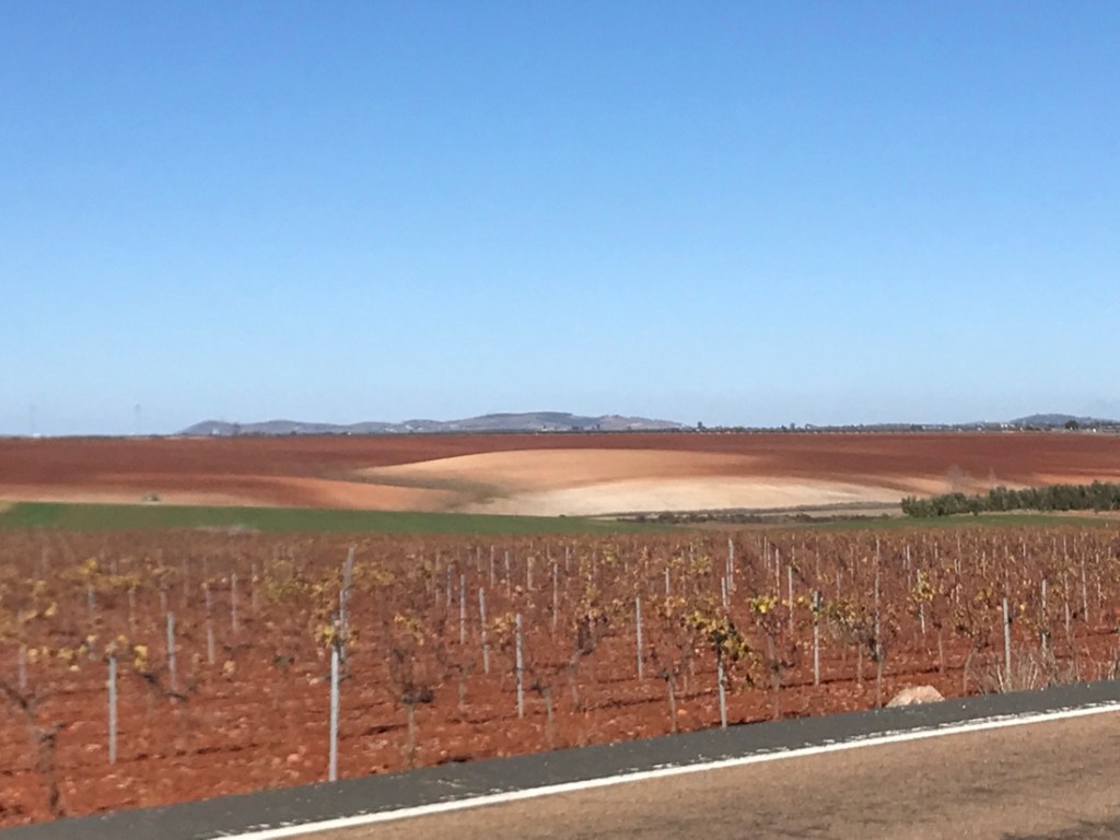 Après un passage dans les chênes, le paysage change complètement. Grandiose !!! Des petites collines à perte de vue, des couleurs, le bonheur de pédaler dans cette immensité, avec très peu de circulation. Nos téléphones portables sont incapables de photographier des paysages. Dommage !
