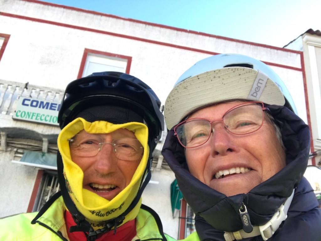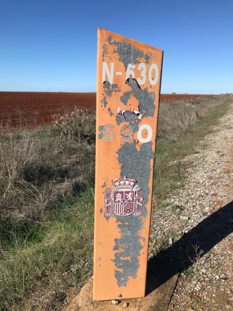 Arrêt à Fuente de Cantos pour boire un café et se réchauffer. Nous n’avons pas reconnu le village, pourtant nous y avons dormi et je suis même allée au centre de soins car j’avais de la fièvre 40,2. La nationale doit juste l’effleurer. C’était le début de ma pyélonéphrite…