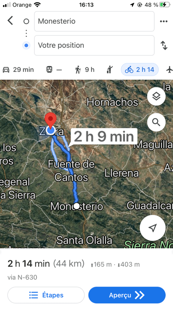Une vue d’ensemble pour montrer que nous montons vers le Nord depuis que nous avons quitté Séville. C’est à Badajos que nous rentrerons à nouveau au Portugal.