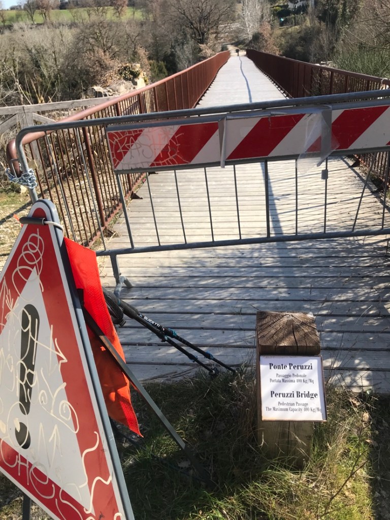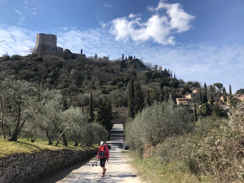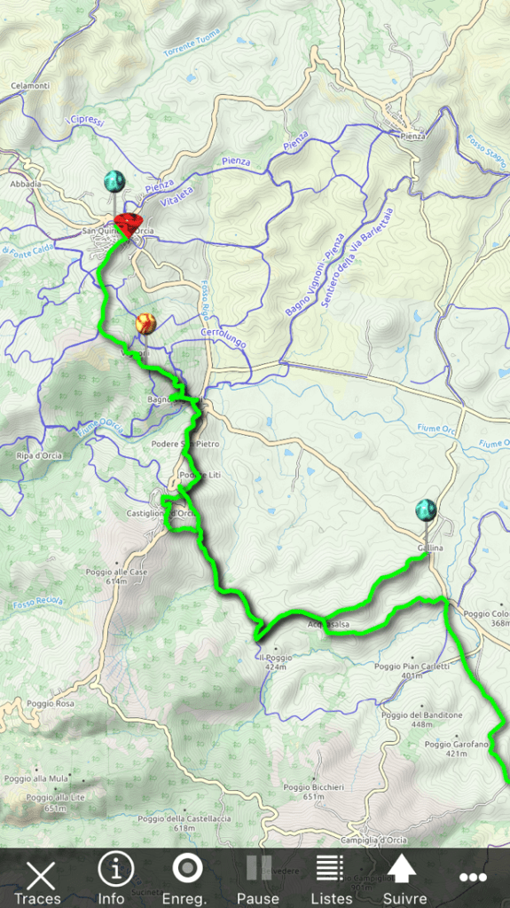 Nous avons démarré au poteau bleu. En enlevant tout le début cela nous a permis d’avoir le courage de sortir du chemin pour monter à Castiglione d’Orcia. Comme d’habitude la fin du parcours est à la flèche rouge.