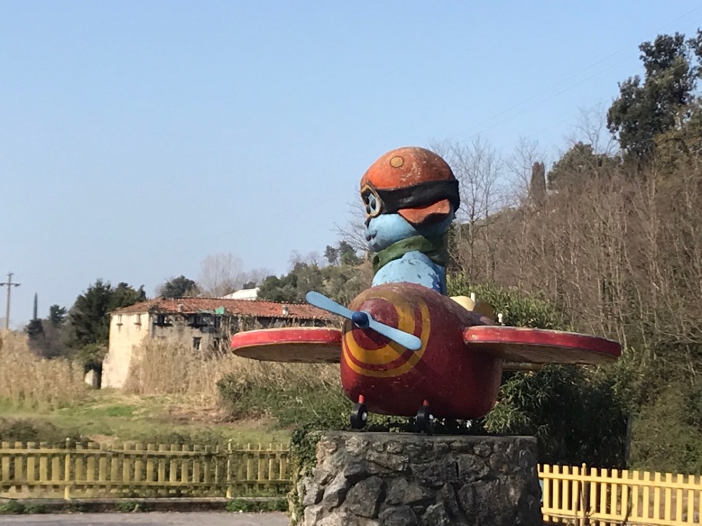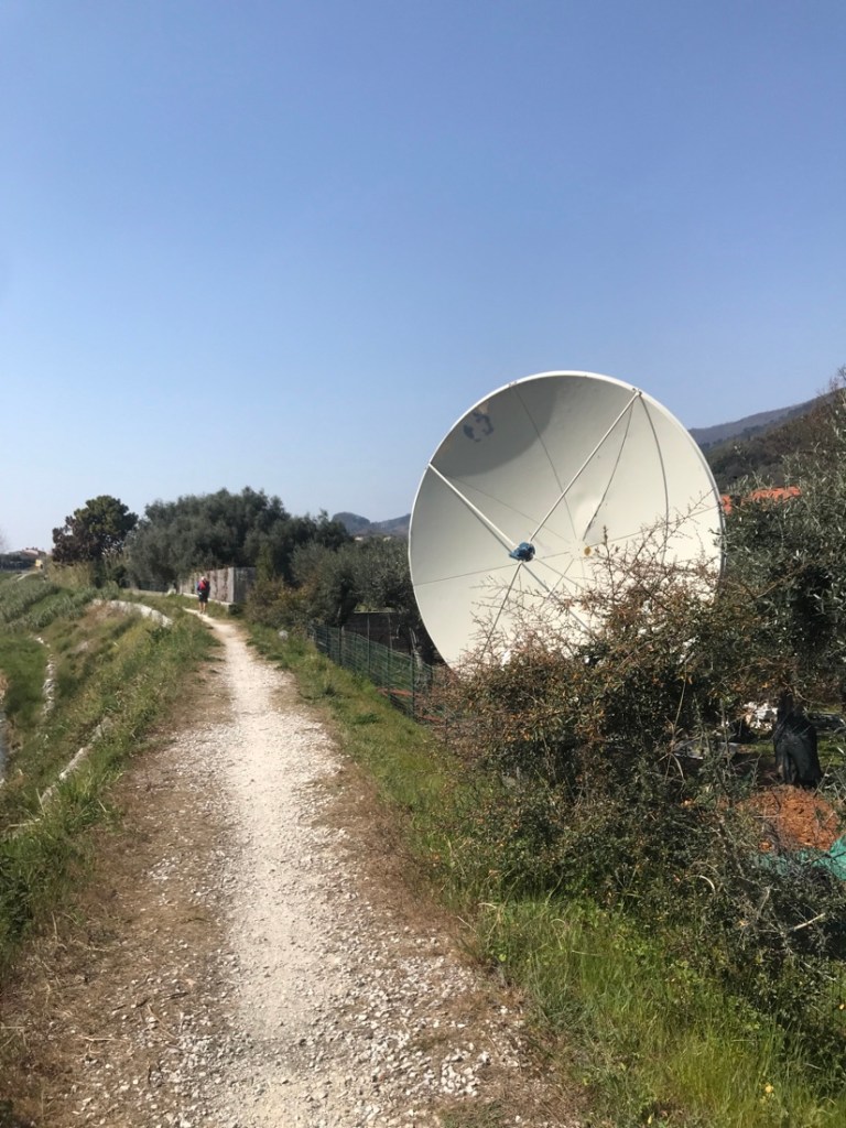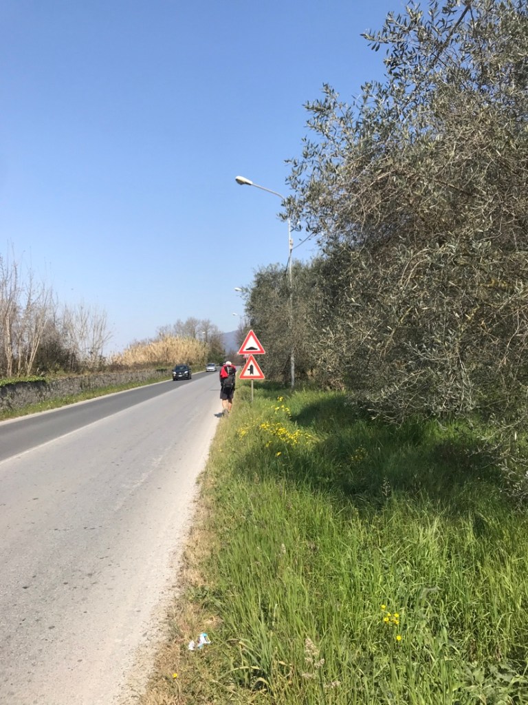 L’étape d’aujourd’hui, nous avons marché de Camaiore (poteau jaune et rouge, en bas à droite) jusqu’à Forte dei Marmi à peu près la moitié de l’étape qui était trop longue pour moi et nous avons pris le train jusqu’à Avenza, la petite flèche rouge. Comme ça l’étape de demain qui est trop longue sera raccourcie.