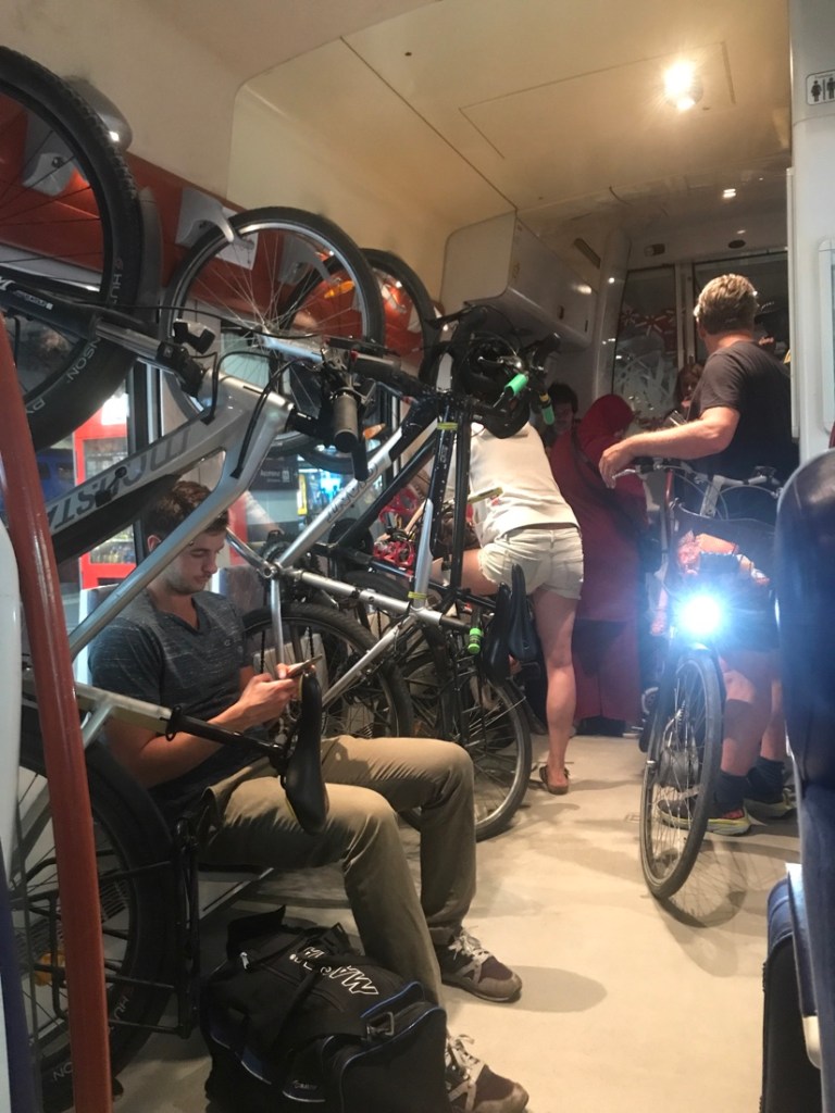 Montpellier, nous qui pensions que le train était vide… du monde partout, des gens debout dans les escaliers, des enfants sur le siège vélo derrière les parents… vite, vite mon vélo a été accroché.