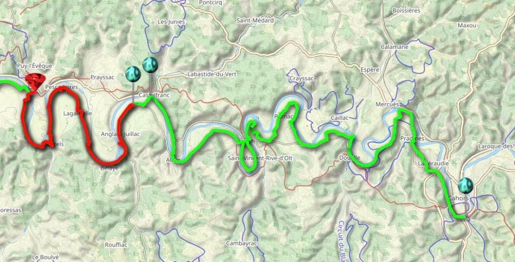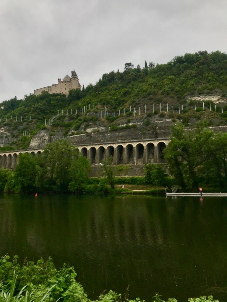 Après une sortie de Cahors sur la grande route, après avoir tourné en rond… mais voyons, vu que nous avons le parcours sur notre téléphone, pourquoi ne l’avons-nous pas regardé ??? Les petits panneaux « Vallée du Lot » étaient fréquents, nous avons tout de même tourné du mauvais côté. Donc nous voici enfin au bord du Lot.