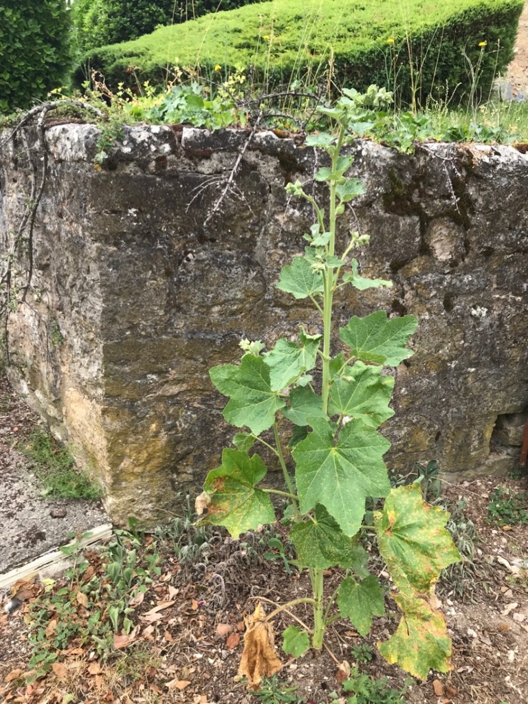 Là, je commence à me faire du souci pour une plantation que j’ai faite avant de partir dans mon jardin. Il y a quelque temps j’ai trouvé des graines de roses trémières dans mon cellier. Je les ai semées dans une caisse, de toutes petites plantes sont sorties et juste avant de partir je les ai repiquées dans mon jardin. Avant qu’elles soient comme celle-là qui est prête à fleurir, on sera peut-être en hiver. Et ce n’est pas sûr que ce soit des roses trémières qui ont germé, ce sont peut-être des graines qui étaient dans la terre dont je me suis servie. Je n’ai pas pris du terreau, j’ai pris de la terre sous mes arbousiers…
