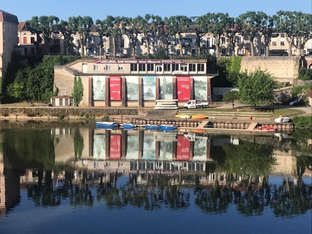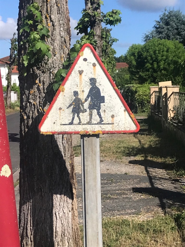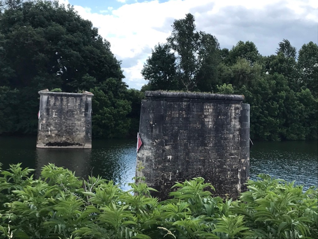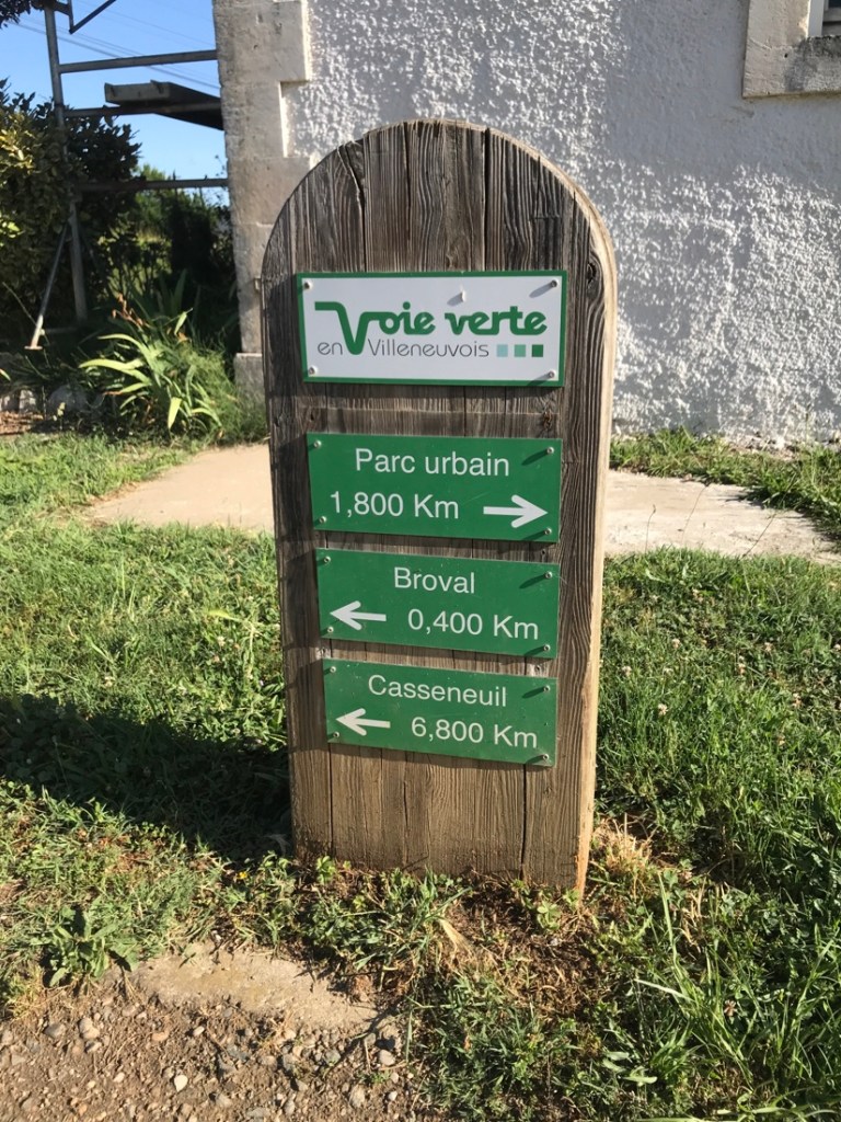Borne hectométrique. Nous pédalons tout de suite sur une voie verte très agréable jusqu’à Casseneuil. Nous trouverons ensuite ces bornes tous les 200 m.