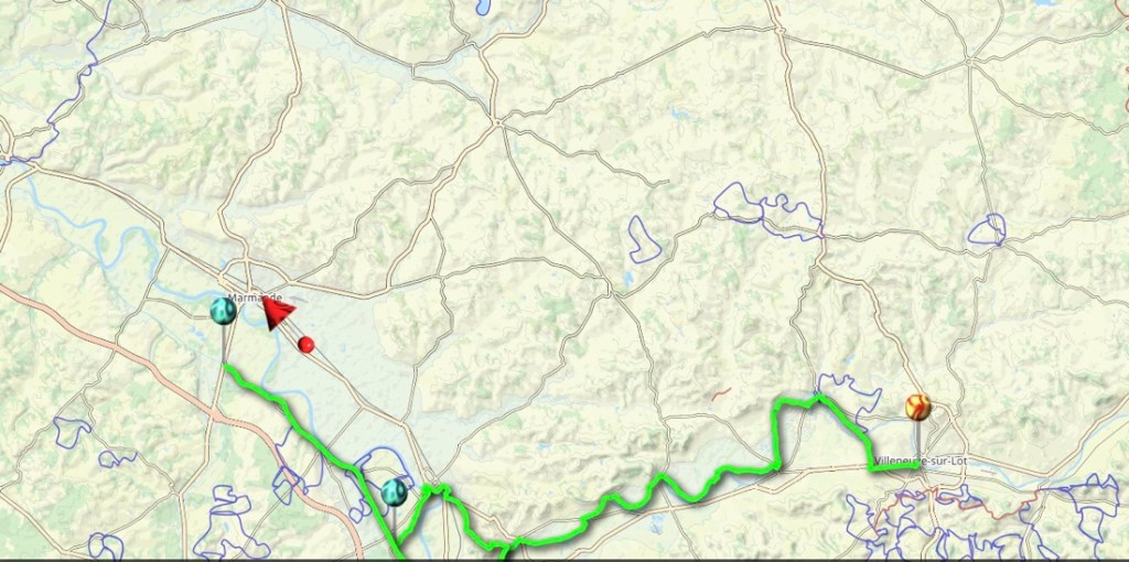 Première partie horizontale, le long du Lot ensuite sur la gauche nous remontons au bord du Canal des 2 Mers pour finir à Marmande, petite flèche rouge.