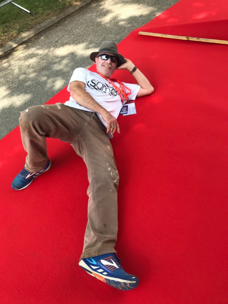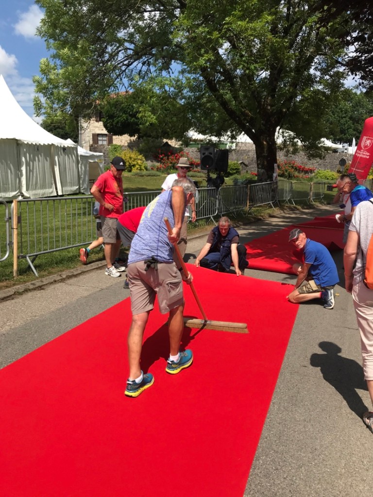 Marouflage du tapis rouge pour l’arrivée des coureurs.