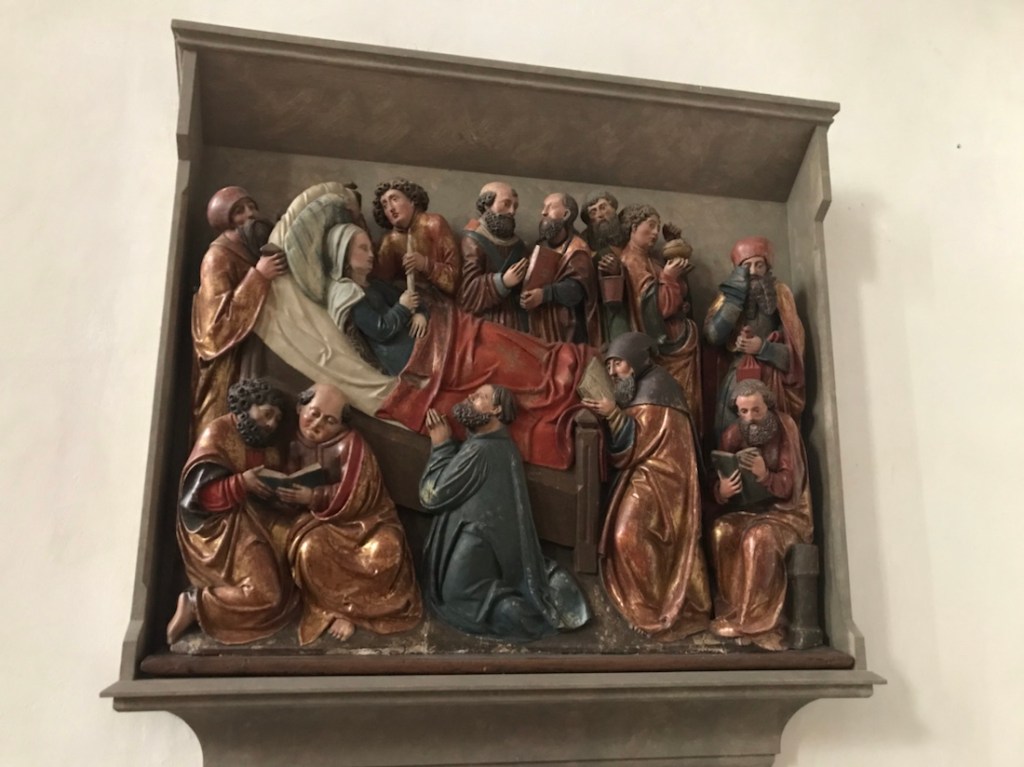 Les personnages du bas prennent le relais en tournant sur eux-mêmes. C’est la danse des tonneliers qui brandissent des cerceaux de barils décorés de fleurs pour célébrer la fin de la peste.