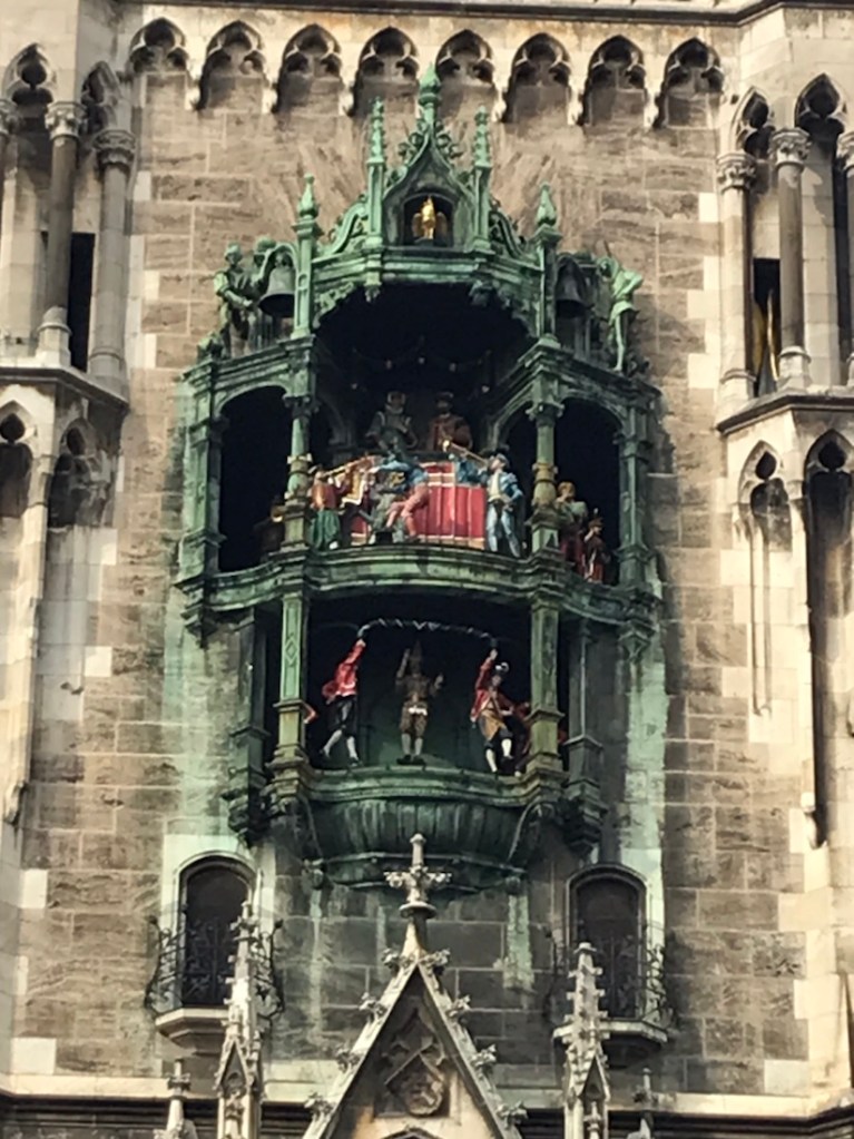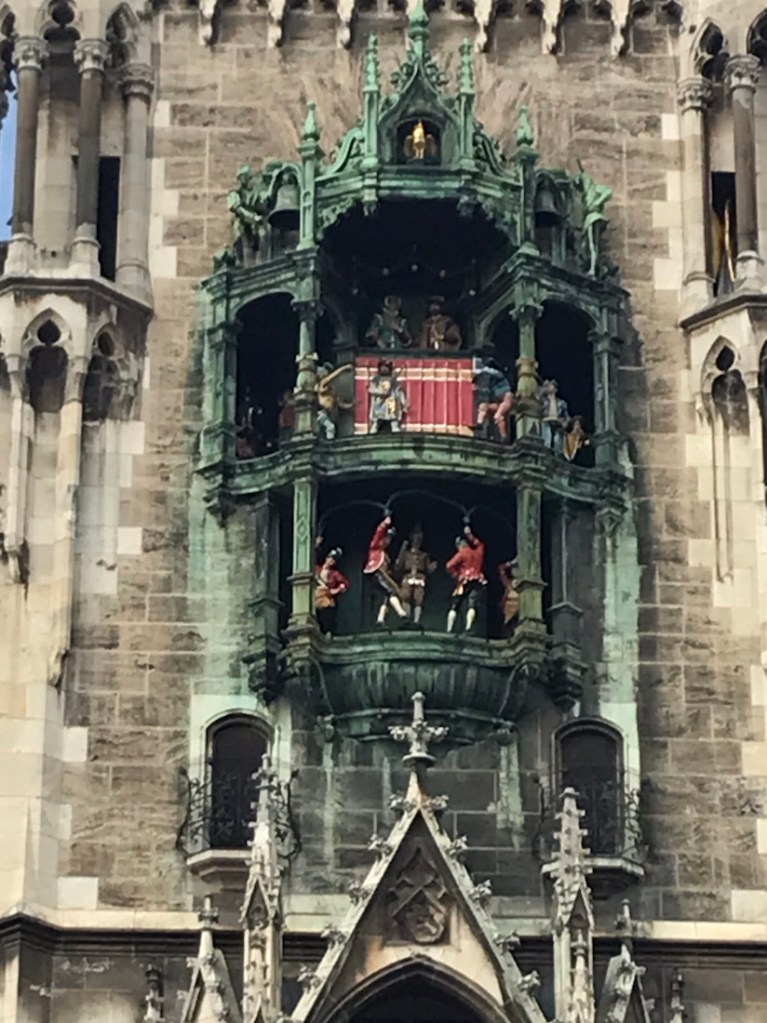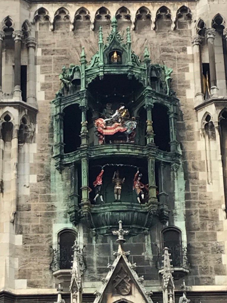 Nous sommes retournés sur la place de l’hôtel de ville vers 17 h pour écouter et voir le carillon en mouvement. Au départ que des sons.