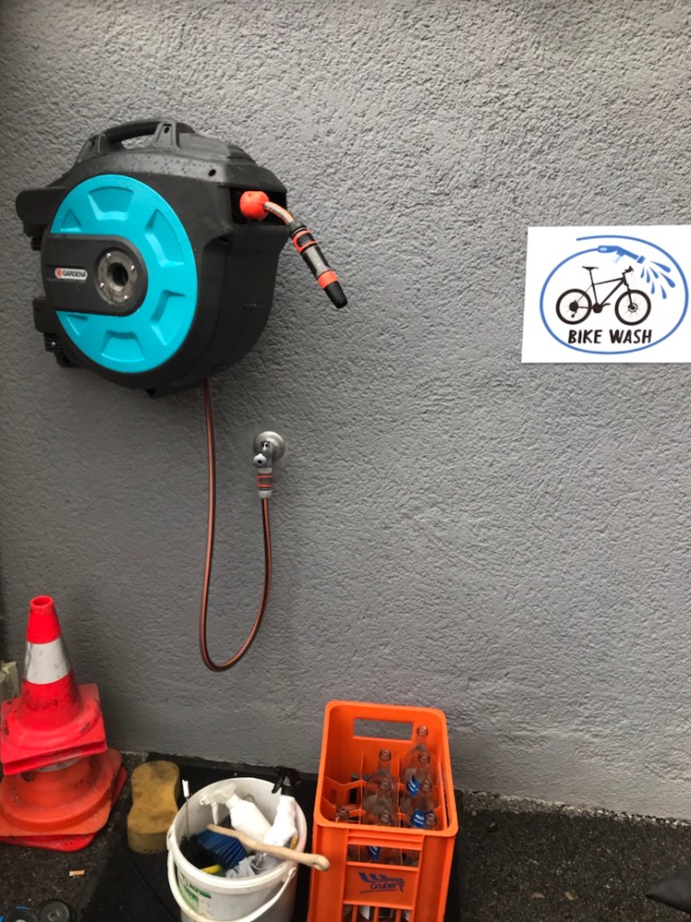 Dans la cour de l’hôtel, pour nettoyer les vélos. Tout est fait pour le vélo, dans les hôtels il y a toujours une pièce réservée pour les vélos et les skis…