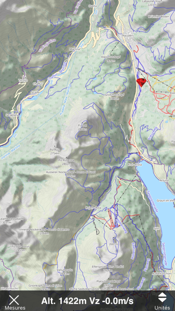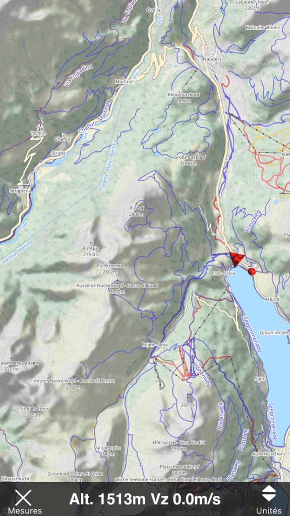 J’ai découvert, il y a deux jours qu’Iphigenie pouvait donner l’altitude. Mieux vaut tard que jamais. Capture d’écran lorsque nous sommes descendus du bus. Nous sommes partis de Landeck à 800 m d’altitude, c’est appréciable d’avoir pris le bus, 600 m de dénivelé en moins dans nos mollets !!!