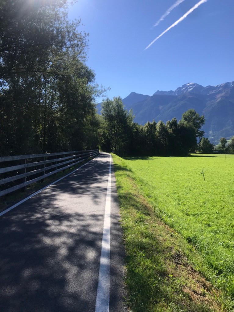 Magnifique journée. Le soleil est de retour. Pistes cyclables tout le long. Nous sommes passés de 1000 m d’altitude à 300 m… je n’aurais pas aimé être dans l’autre sens surtout à la fin, nous avons croisé des gens qui poussaient leur vélo.