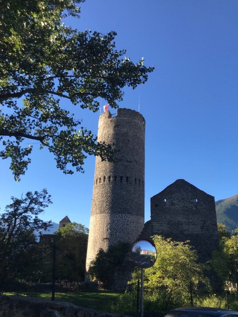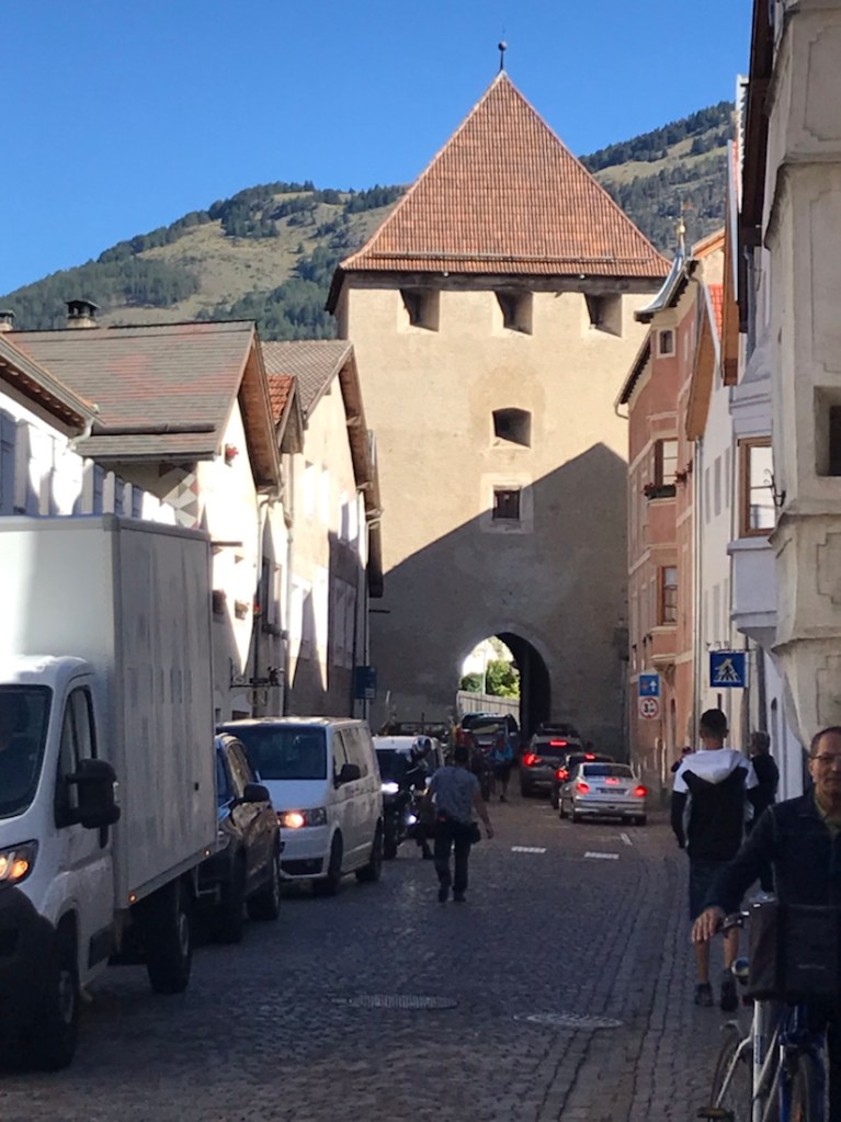 Glurns/Glorenza. Embouteillage. On doit passer par la porte pour rentrer dans le village. Lorsque nous sommes arrivés, immense embouteillage, un bus essayait de sortir par cette porte étroite.