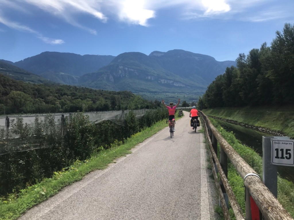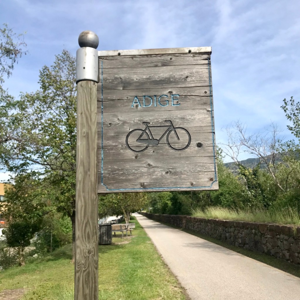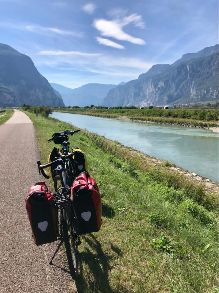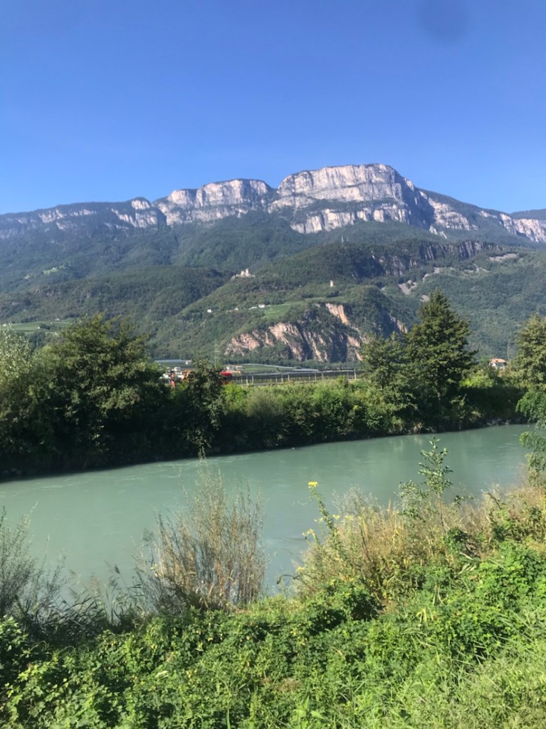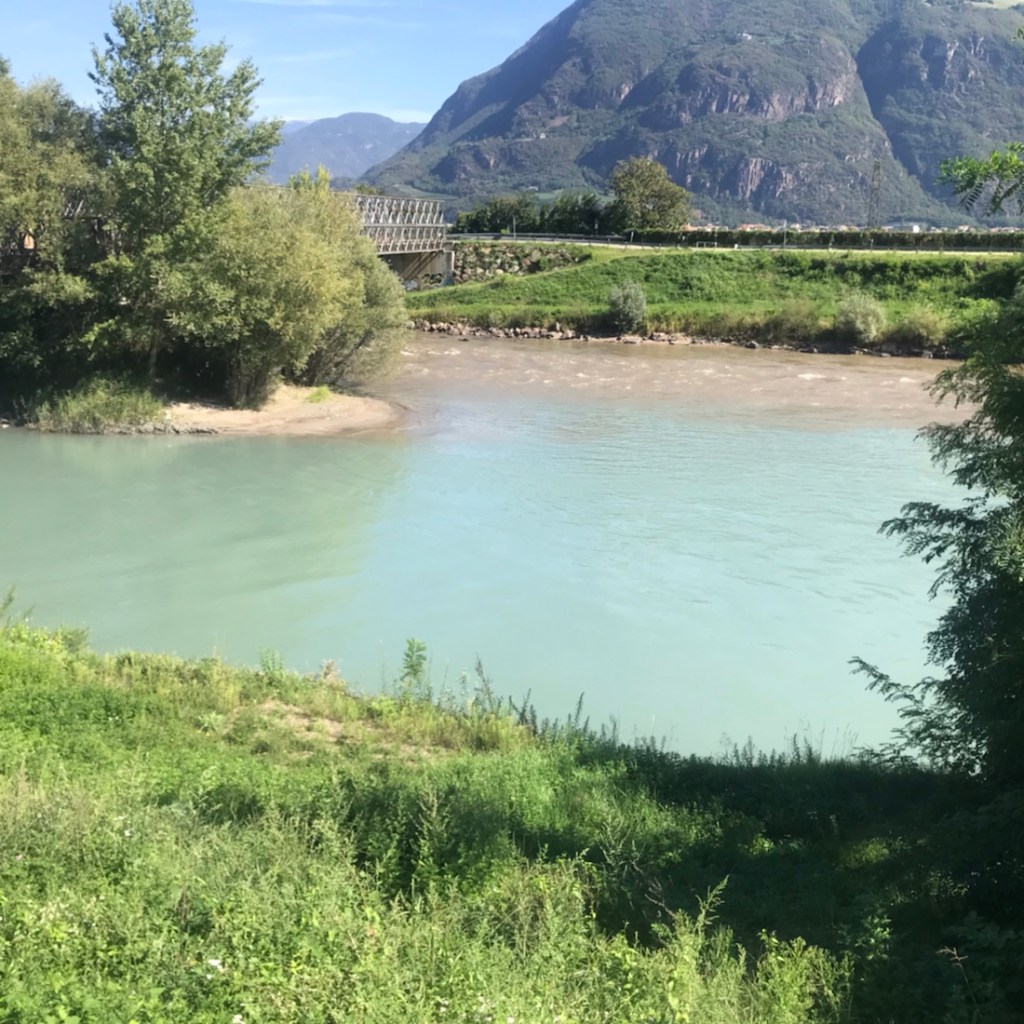 Ça faisait un moment qu’on pédalait entre une rivière assez claire et une rivière boueuse. Ici c’est le confluent ou la confluence de ces deux rivières. La boueuse l’Isarco et la plus claire l’Adige.