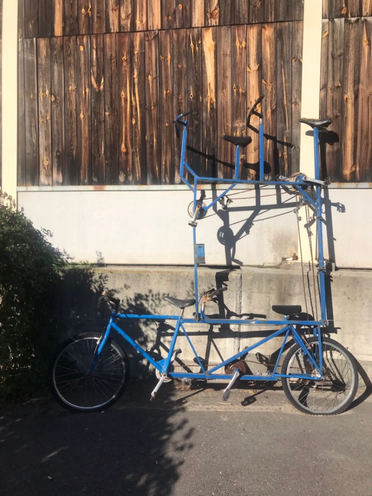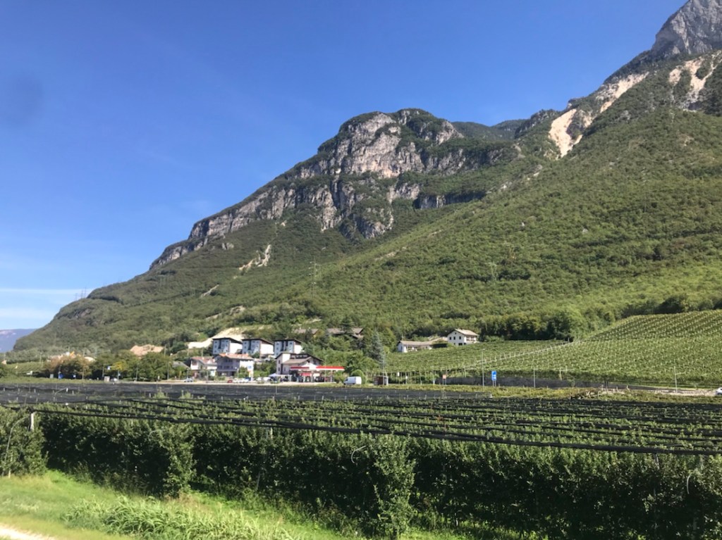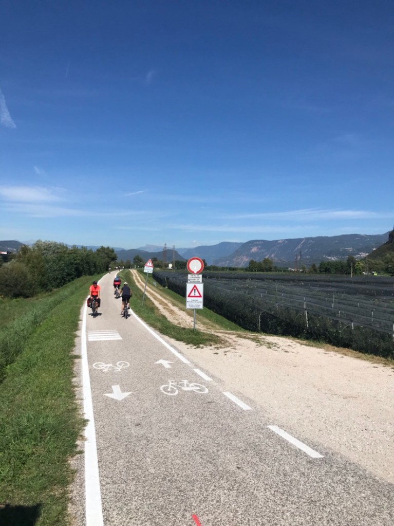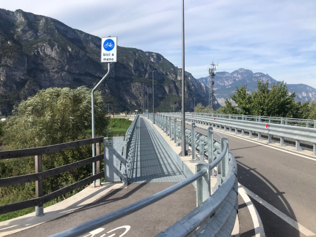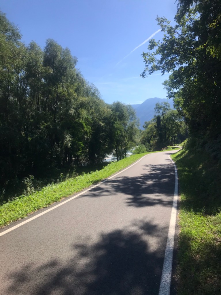 Ça faisait un moment qu’on pédalait entre une rivière assez claire et une rivière boueuse. Ici c’est le confluent ou la confluence de ces deux rivières. La boueuse l’Isarco et la plus claire l’Adige.