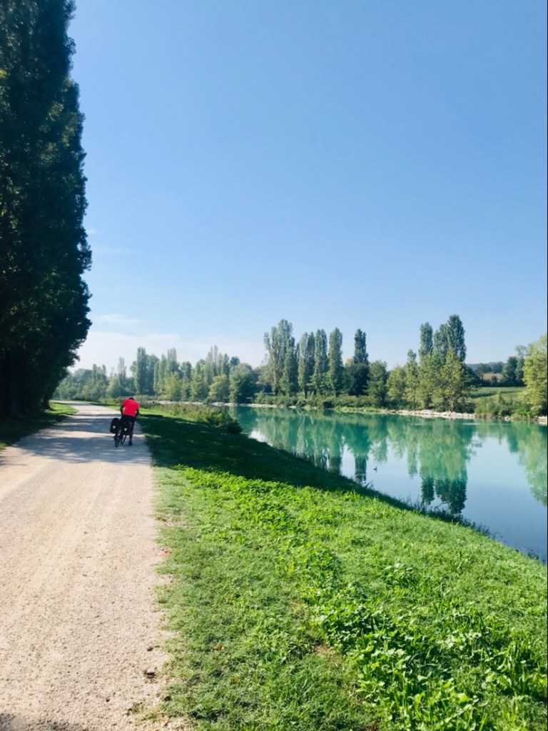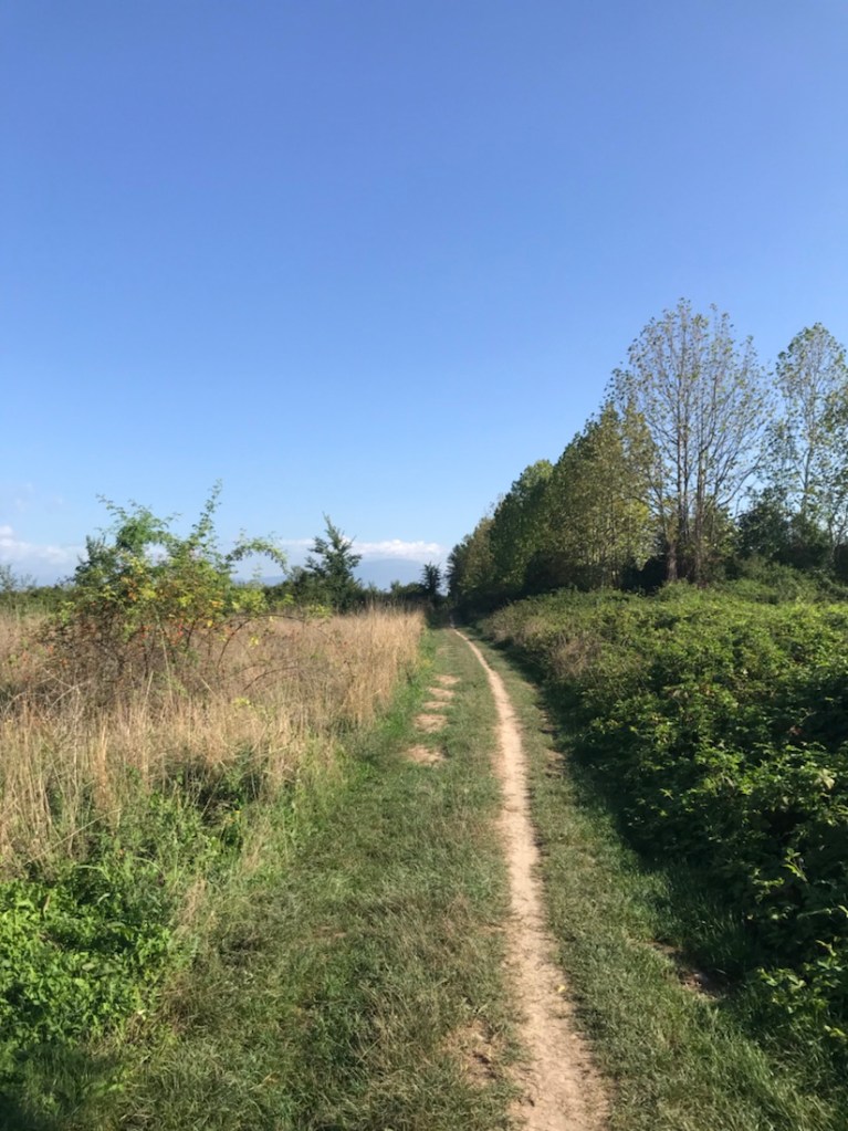 Je crois que nous ne verrons peut-être plus des pistes cyclables comme celles que nous avons eues depuis notre départ. Ceci est un chemin de traverse que nous avons pris ce matin, je n’ai photographié que la fin, à un moment c’était boueux et plein de ronces, j’ai poussé mon vélo….