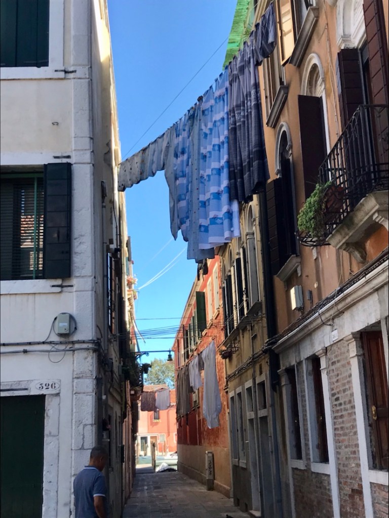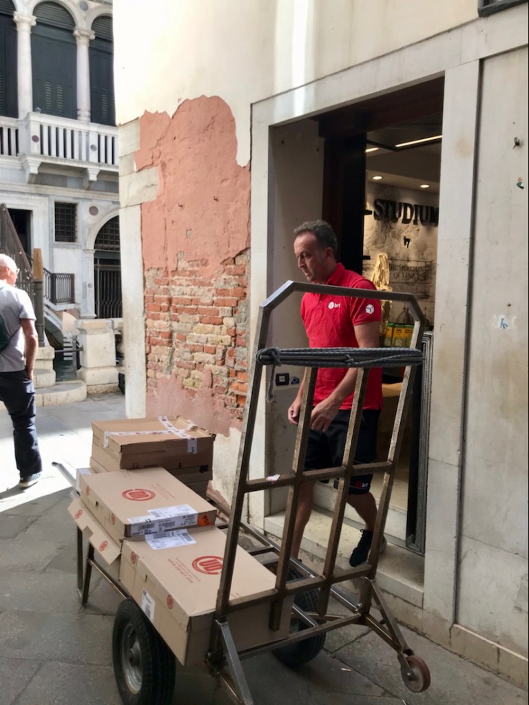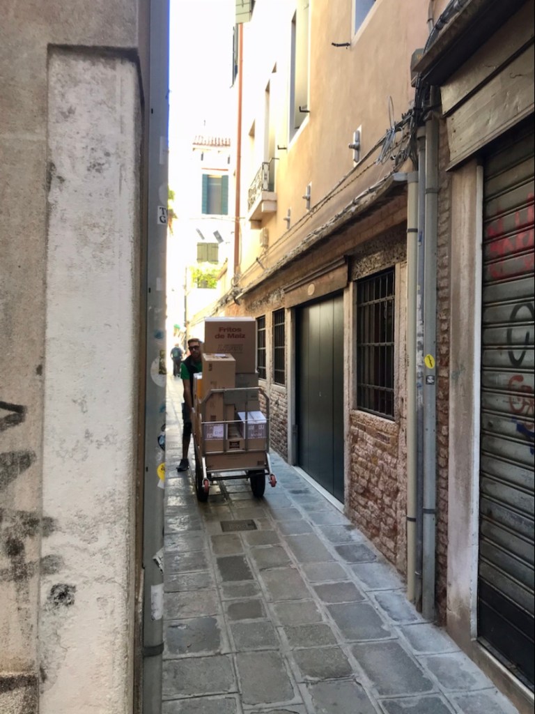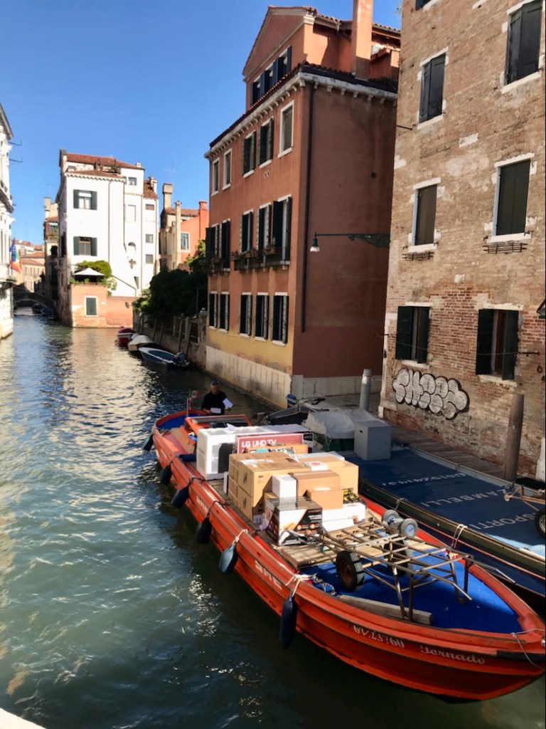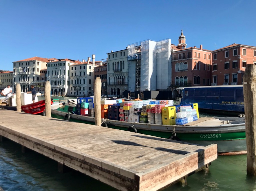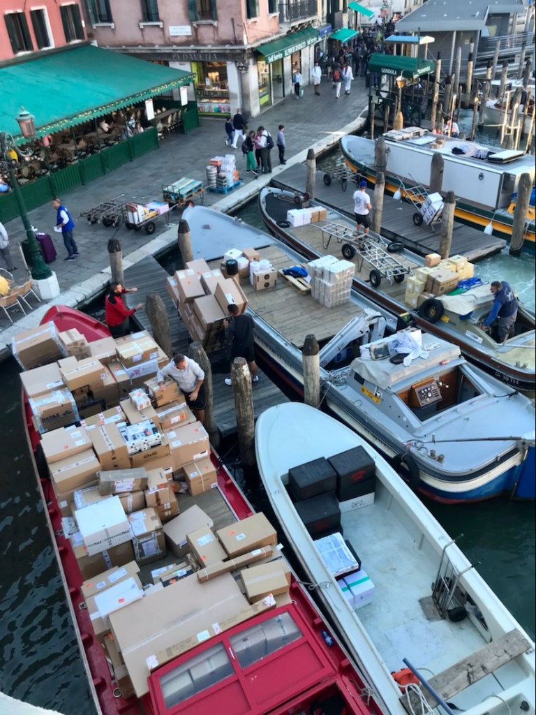 Retour à Venise ce matin. Ça commence par la ville qui se ravitaille. Là, du linge pour les hôtels.