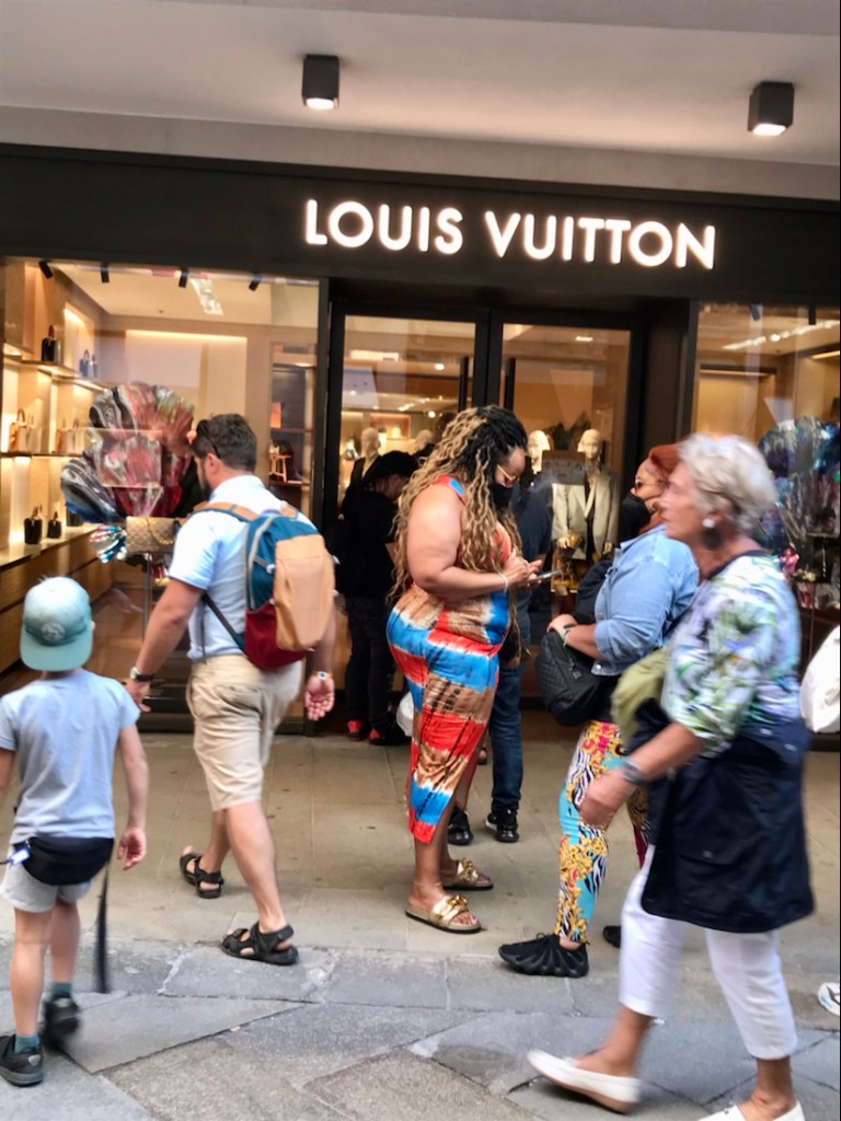 Quartier des boutiques de luxe. Il y a la queue devant Vuitton.