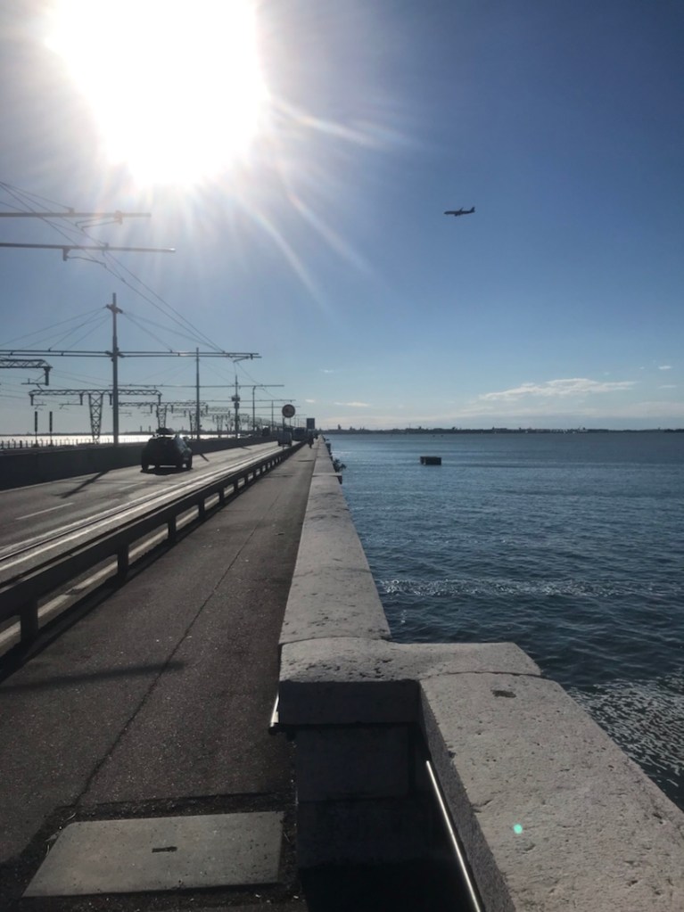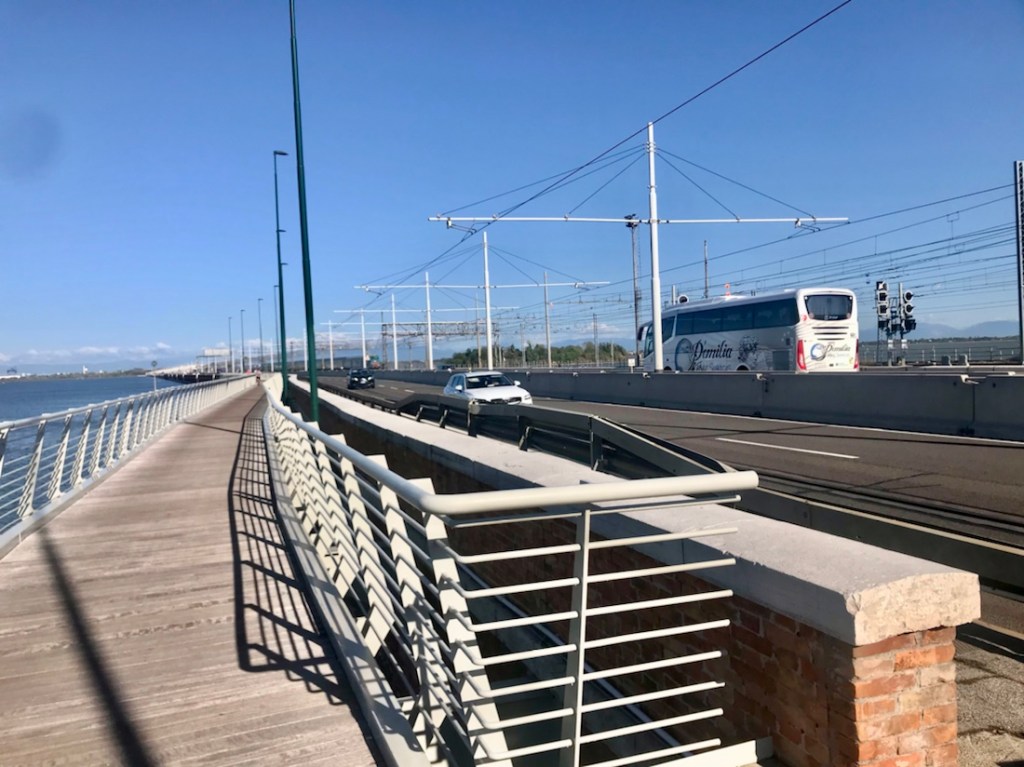 Nous allons rouler pendant 3,8 km sur cette piste avec l’eau à droite, et à gauche, une deux fois 2 voies pour les voitures, bus, tram… encore plus à gauche le train. Au bout c’est Venise.