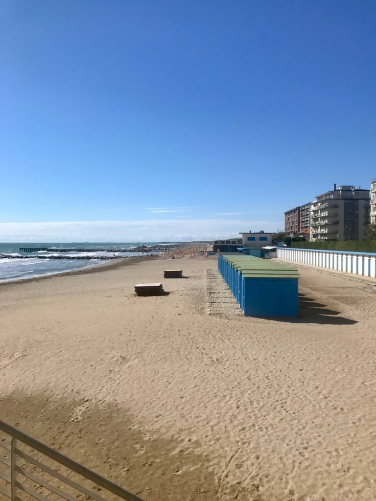 Sottomarina. La vue depuis la terrasse de notre chambre. Grande plage qui doit grouiller de monde en été. C’est bien calme et nous sommes ravis d’être arrivés là par beau temps. Quelle chance de pouvoir partir hors saison !!!