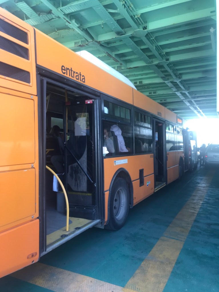 Deuxième ferry, beaucoup plus petit, qui transporte un bus de ville avec les gens qui sont restés dedans…