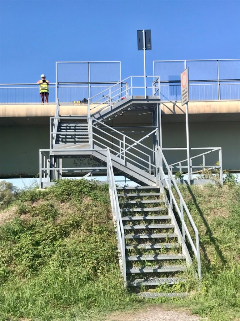 Normalement notre trace nous donnait une route pour pouvoir accéder au pont, elle ne semble plus exister mais à la place il y a cet escalier au niveau de la flèche.