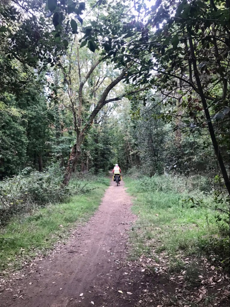 Là, j’ai horreur de ce genre de chemin avec des ornières qui parfois sont un peu trop profondes pour moi, les vrais cyclistes doivent rigoler, alors pour avancer je serre les dents et je languis d’arriver au bout. C’était lonnnng !!!