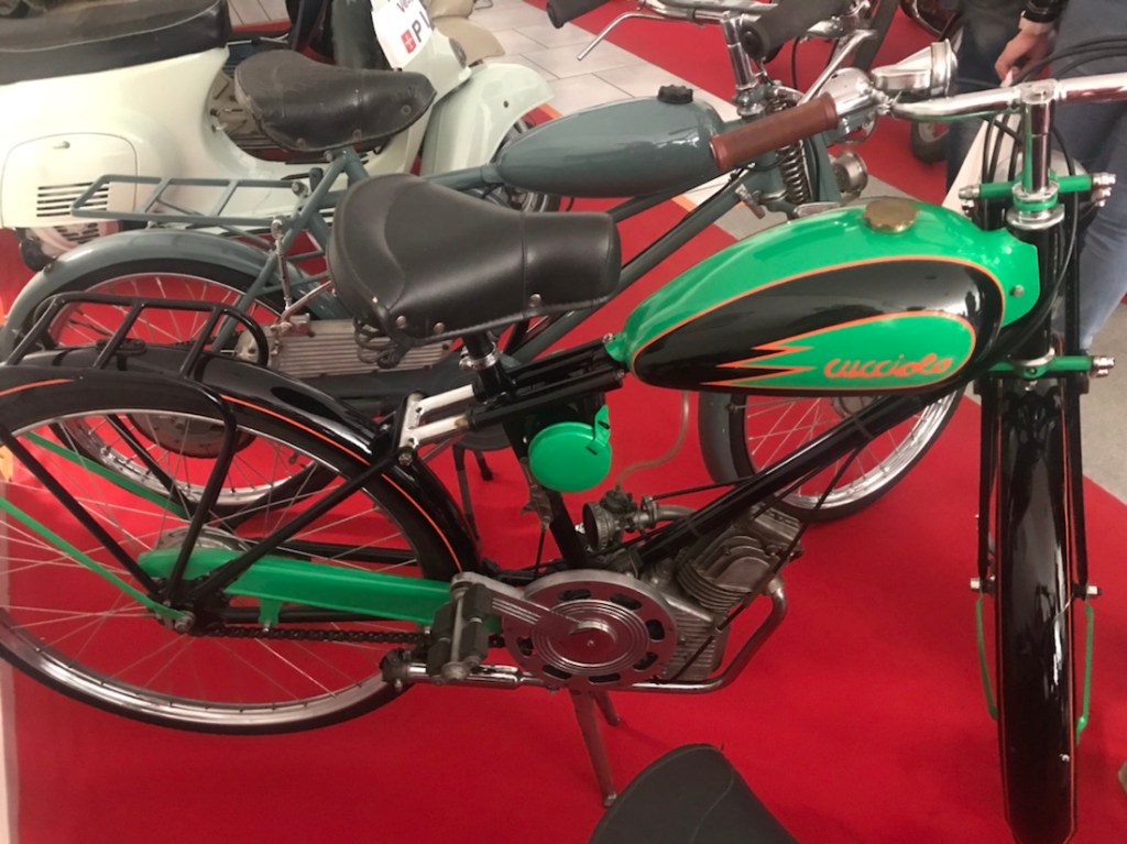 Cucciolo Ducati. Nous avons été attirés par une vitrine remplie de Vespas. C’était une exposition de cycles et motocycles anciens. Celui-ci semblait très important pour le propriétaire du lieu.