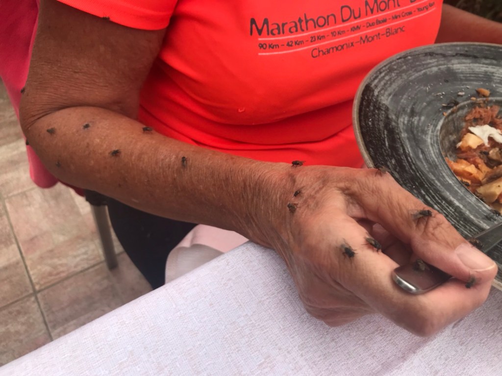 Arrêt pour manger dans un restaurant chic, je ne rigole pas en disant chic. Nous avons changé de place mais les mouches m’ont poursuivie. Je dois commencer à sentir !!! Pourtant je me lave et je lave mes habits…