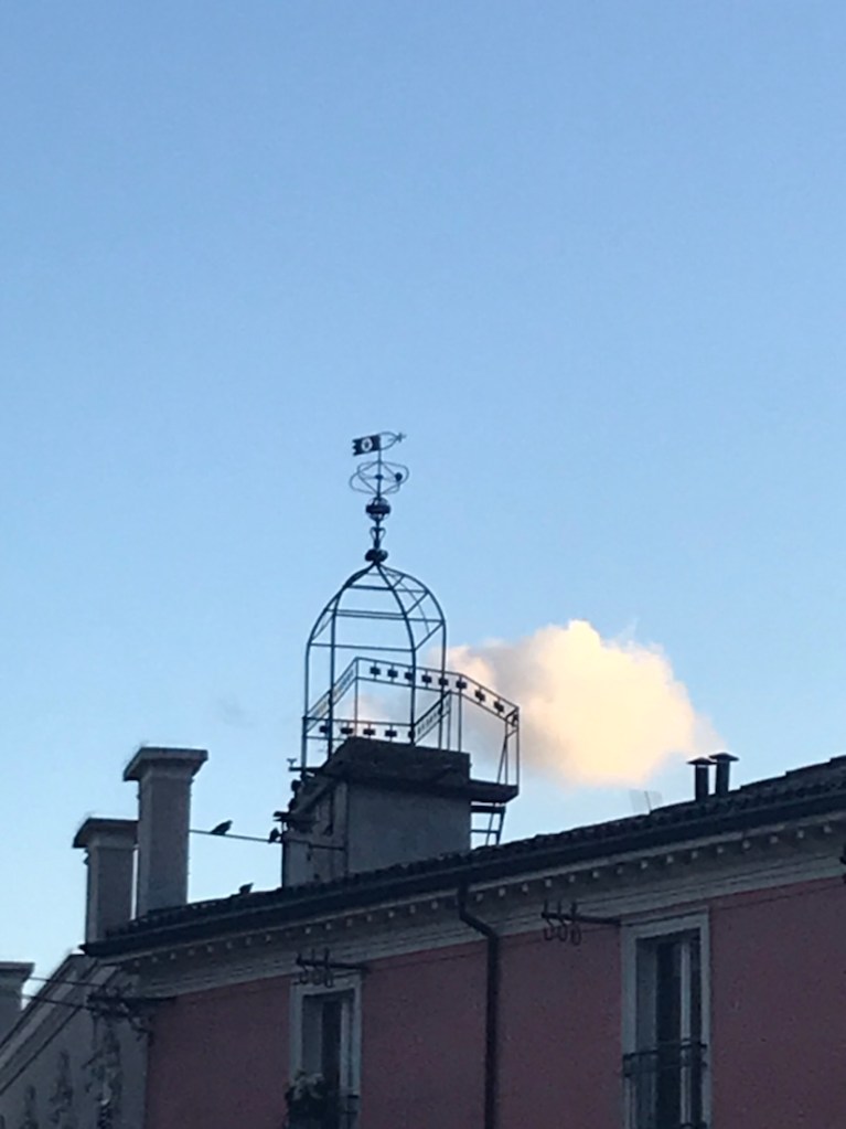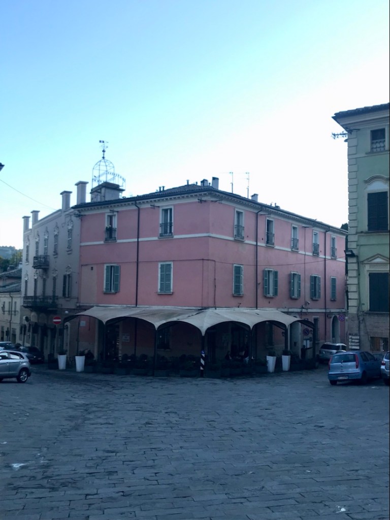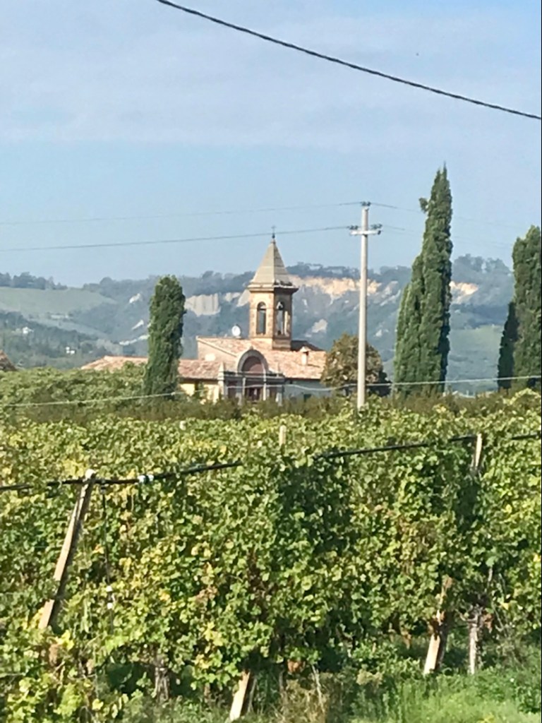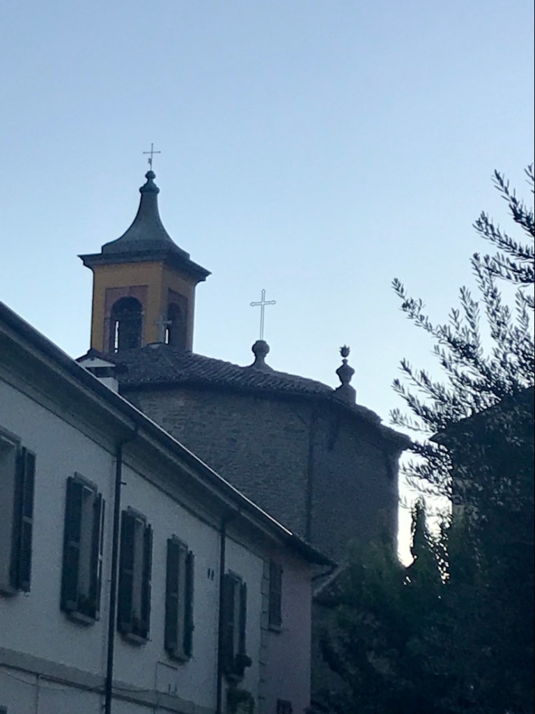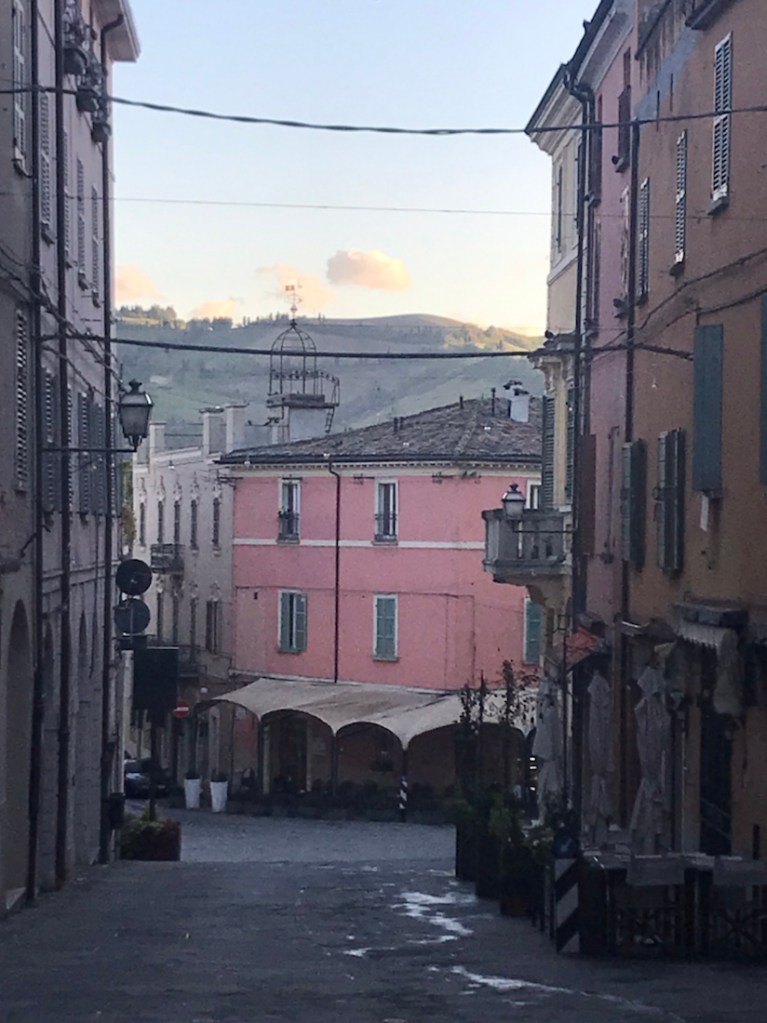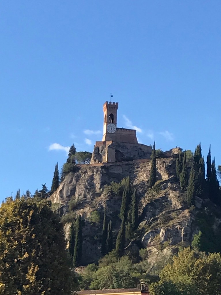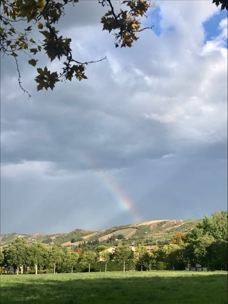 Brisighella. Nous sommes arrivés à l’hôtel sous un beau soleil. Lorsque nous avons voulu ressortir, il pleuvait. Ça y est le beau temps est de retour avec un arc-en-ciel.